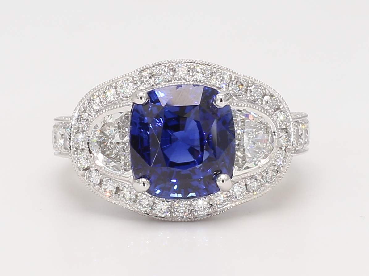 CUSHION SAPPHIRE GIA 1172581257 & HALF-MOON DIAMOND & PAVE’ DIAMOND PLATINUM RING