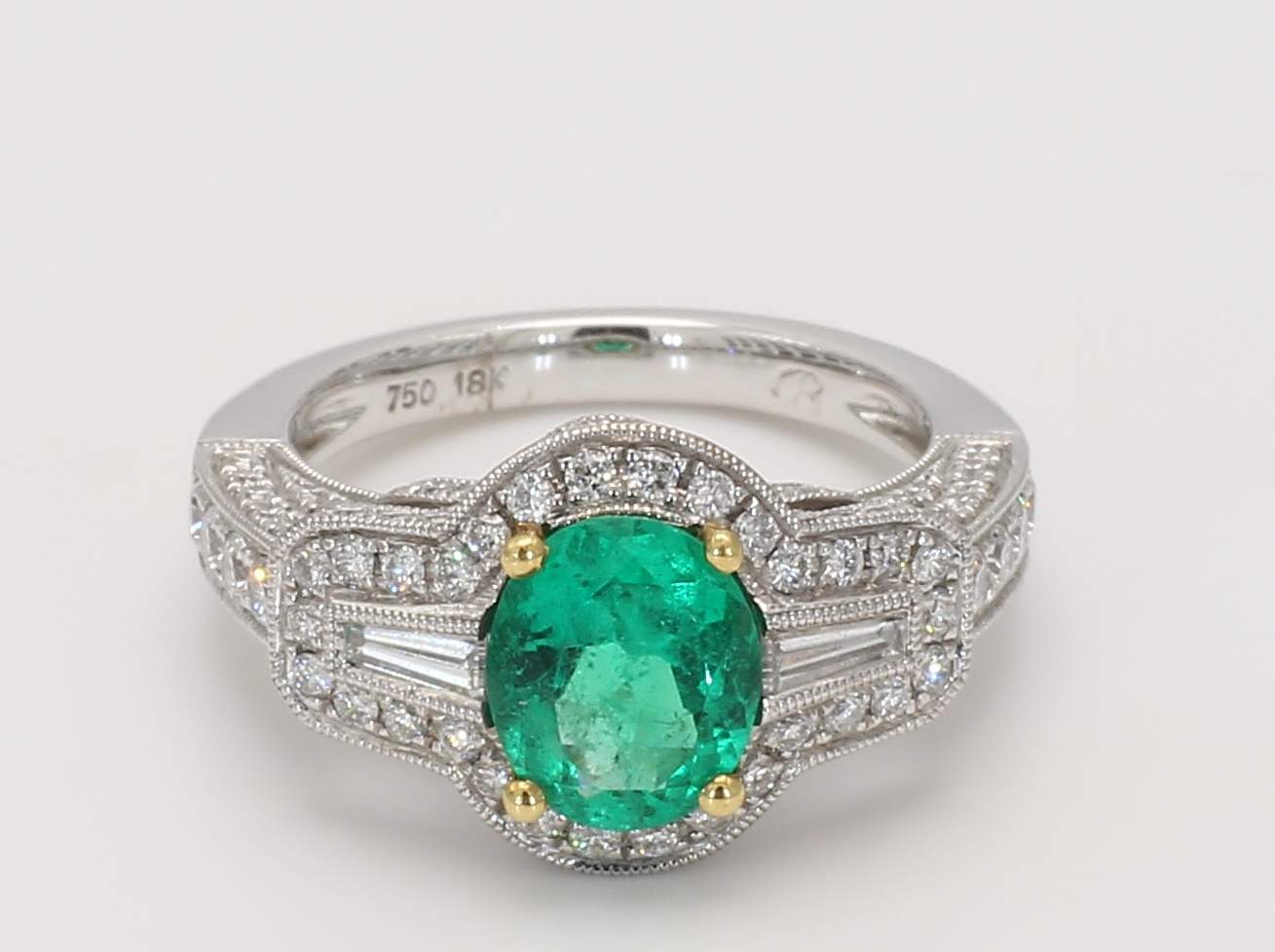OVAL EMERALD & TAPER BAGUETTE DIAMOND & PAVE’ DIAMOND 18KW RING