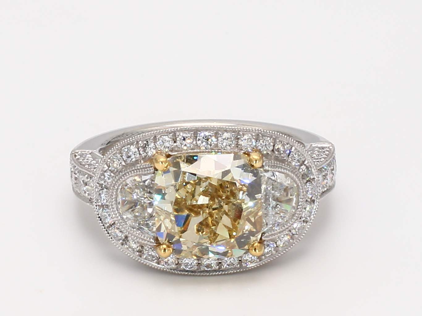 CUSHION FANCY BROWNISH YELLOW DIAMOND VS1 GIA 2105561649 & HALF-MOON & PAVE’ DIAMOND PLATINUM RING