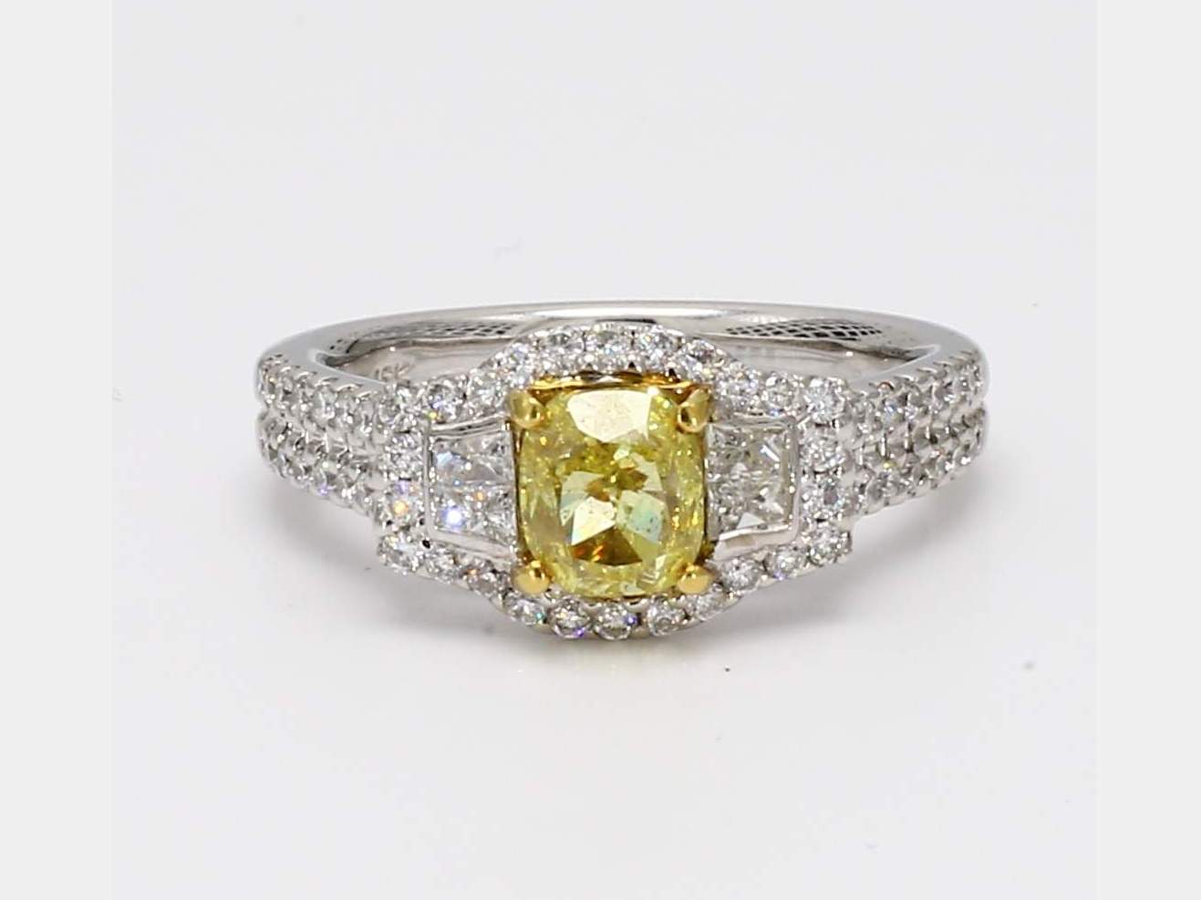 FANCY INTENSE YELLOW SI2 CUSHION DIAMOND GIA 2135802450 & PRINCESS CUT DIAMOND & ROUND DIAMOND 18KW RING