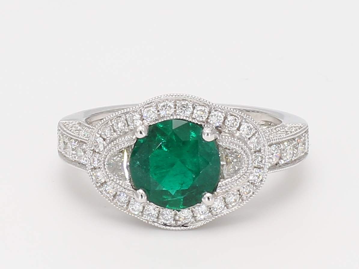 ROUND EMERALD & HALF-MOON DIAMOND & PAVE’ DIAMOND 14KW RING