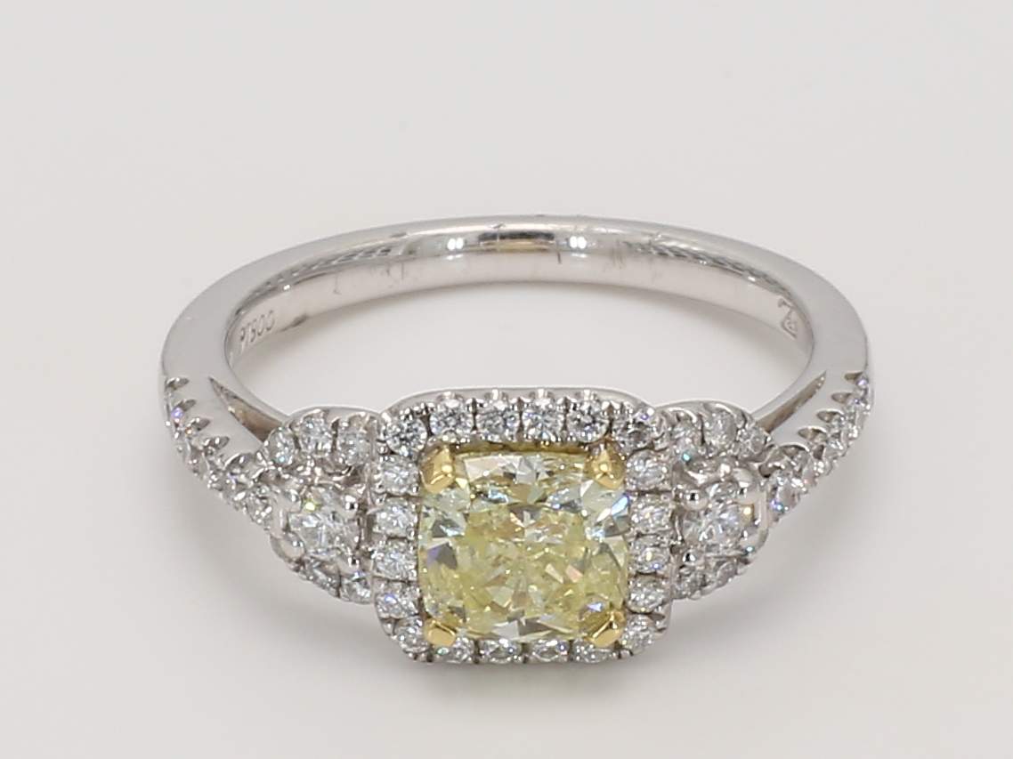 NATURAL FANCY YELLOW CUSHION SI2 DIAMOND GIA 1152047368 & ROUND DIAMOND PLATINUM & 18KW RING