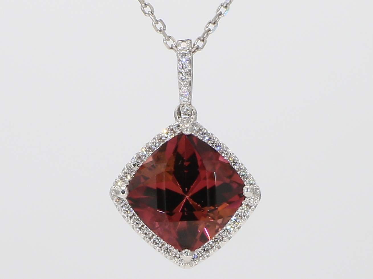 CUSHION RUBELLITE & ROUND DIAMOND 14KW PENDANT