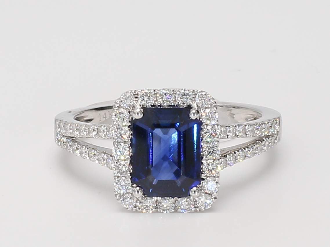 EMERALD CUT CEYLON SAPPHIRE & ROUND DIAMOND 14KW RING