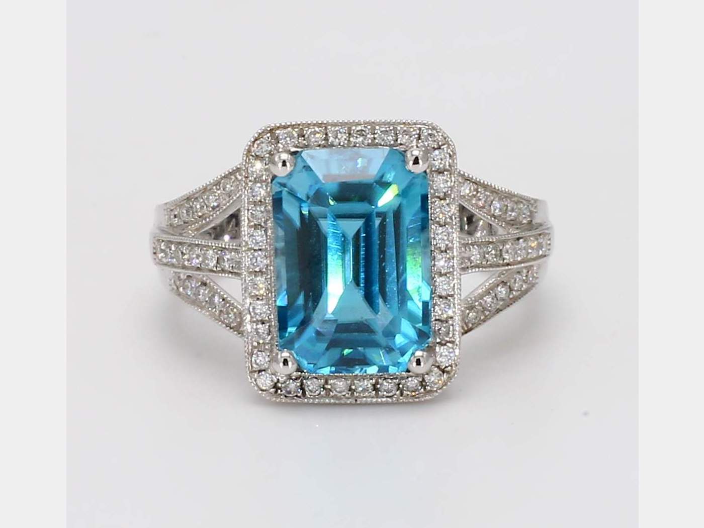 EMERALD CUT BLUE ZIRCON & PAVE’ DIAMOND 14KW RING