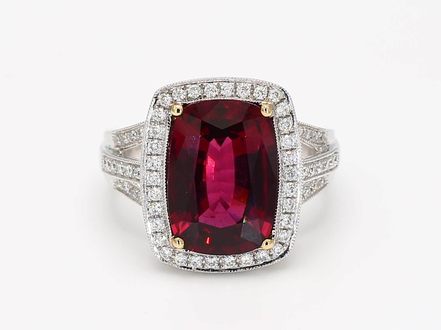 CUSHION PURPLISH RED SPINEL GIA 2145456525 & PAVE DIAMOND 14KT RING