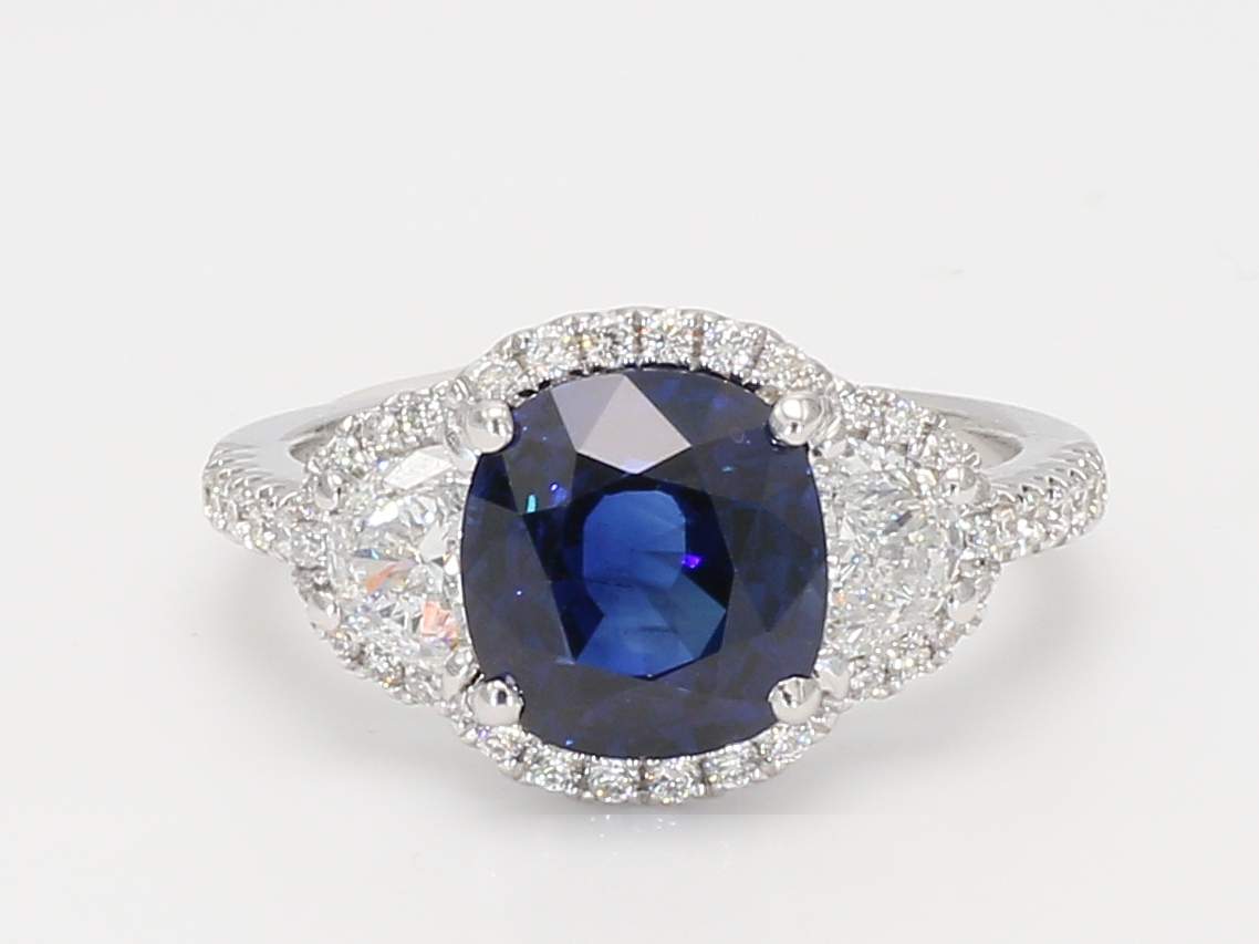 CUSHION SAPPHIRE GIA 2165243005 & HALF-MOON & ROUND DIAM0ND 14KW RING
