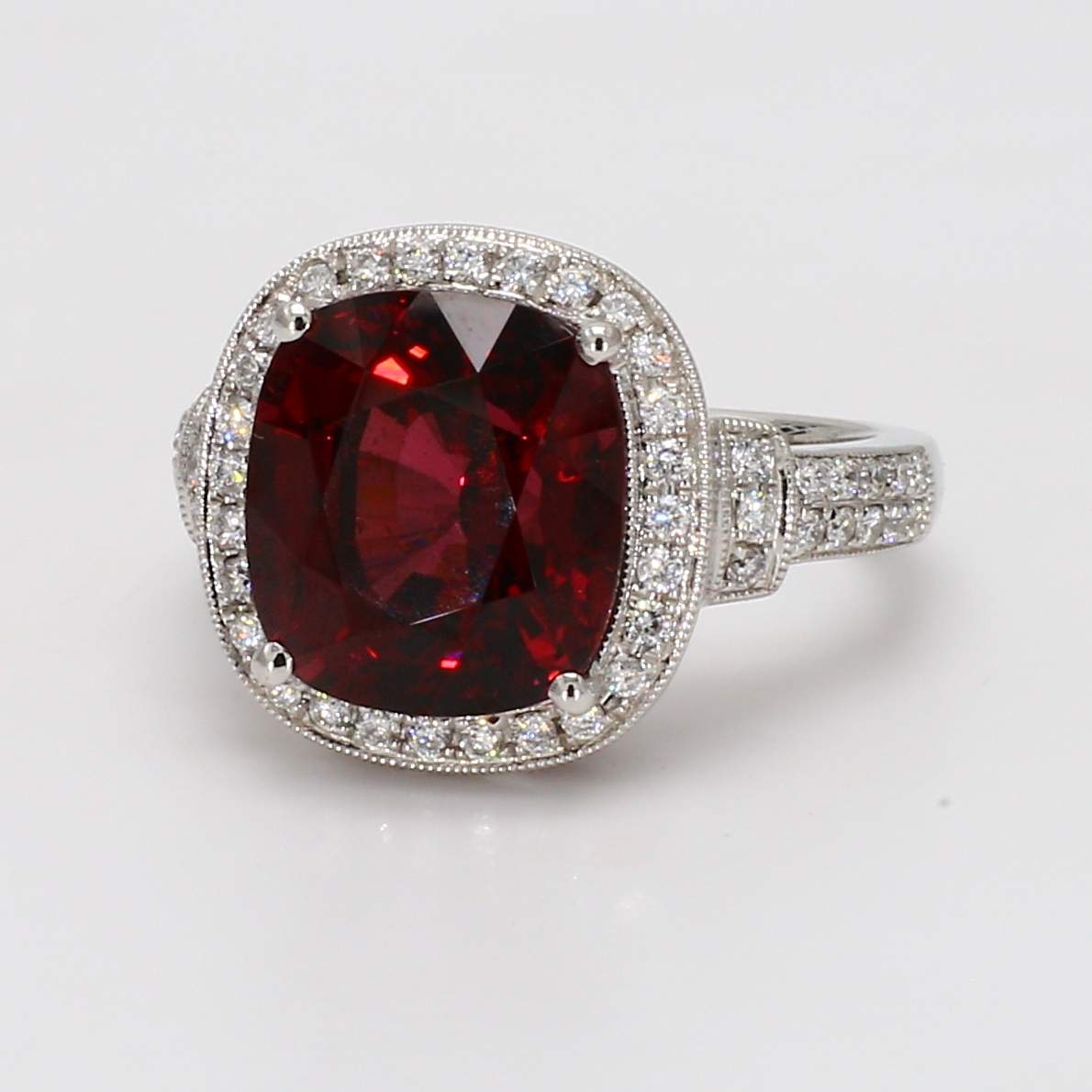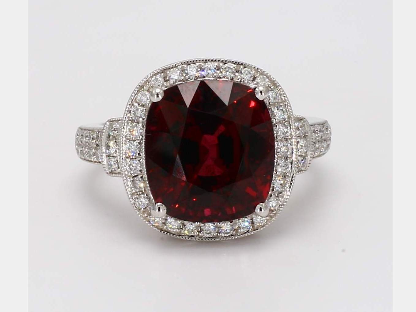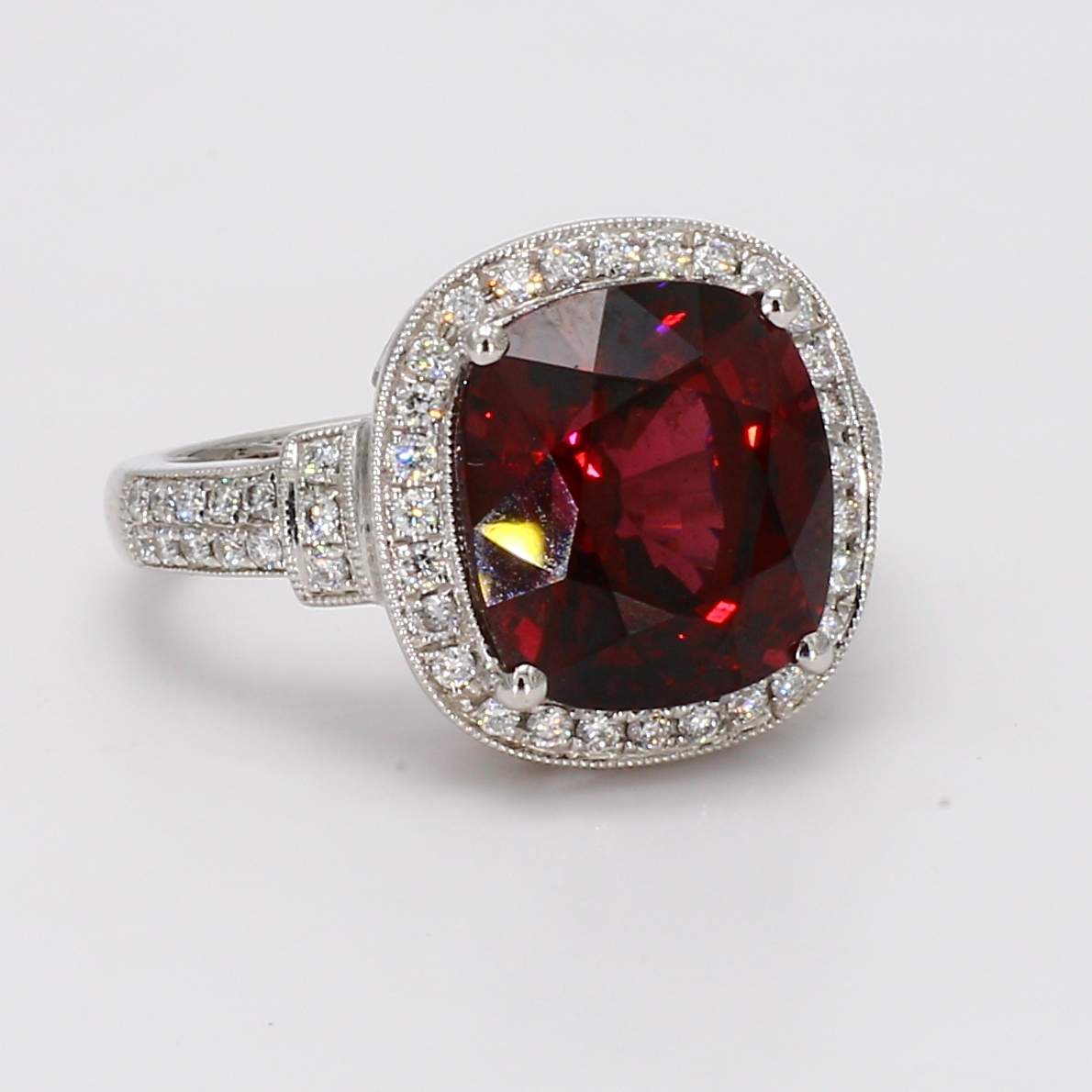 CUSHION RHODOLITE GARNET & ROUND DIAMOND 14KW RING