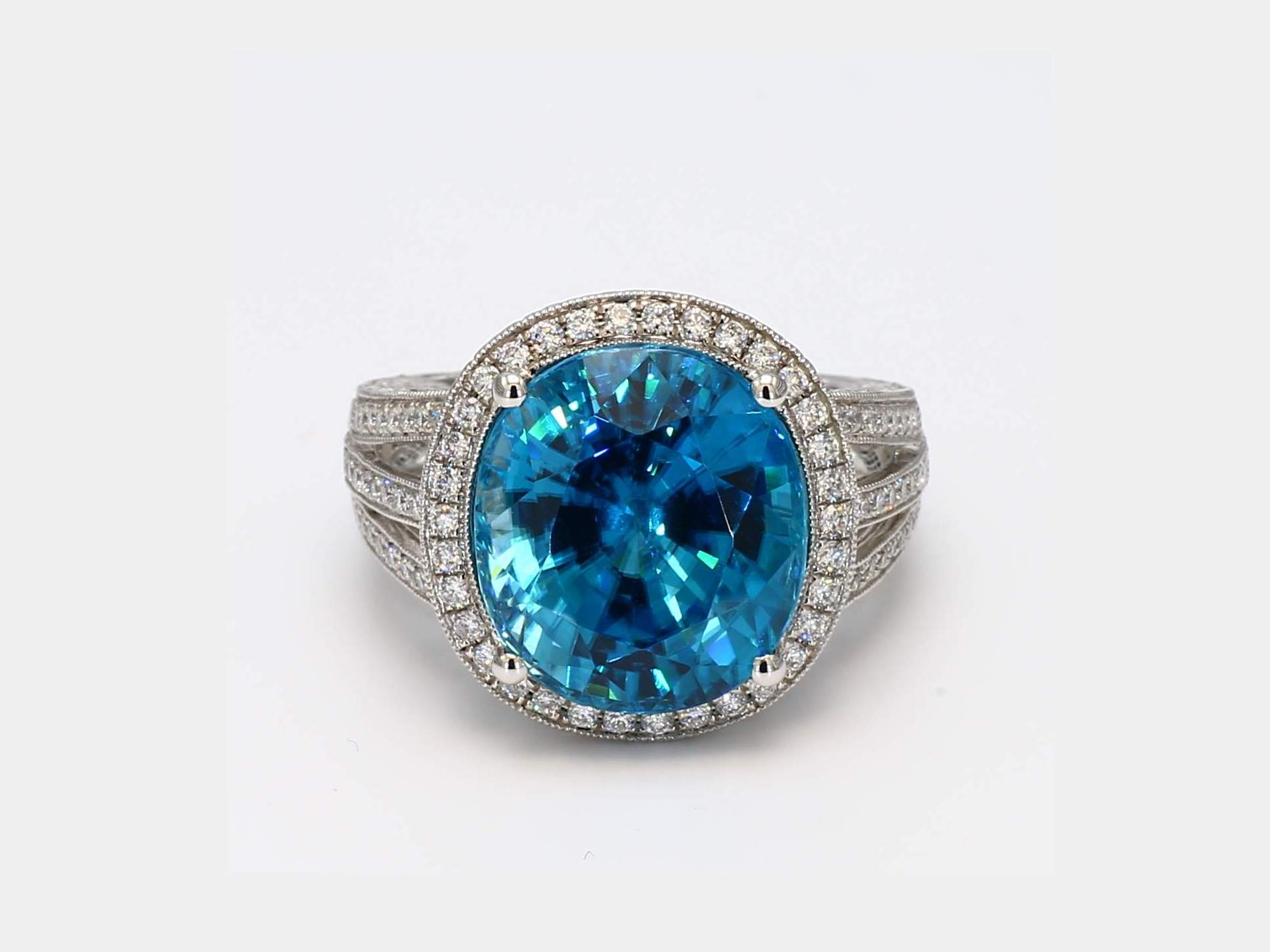 OVAL BLUE ZIRCON & ROUND DIAMOND 14KW RING