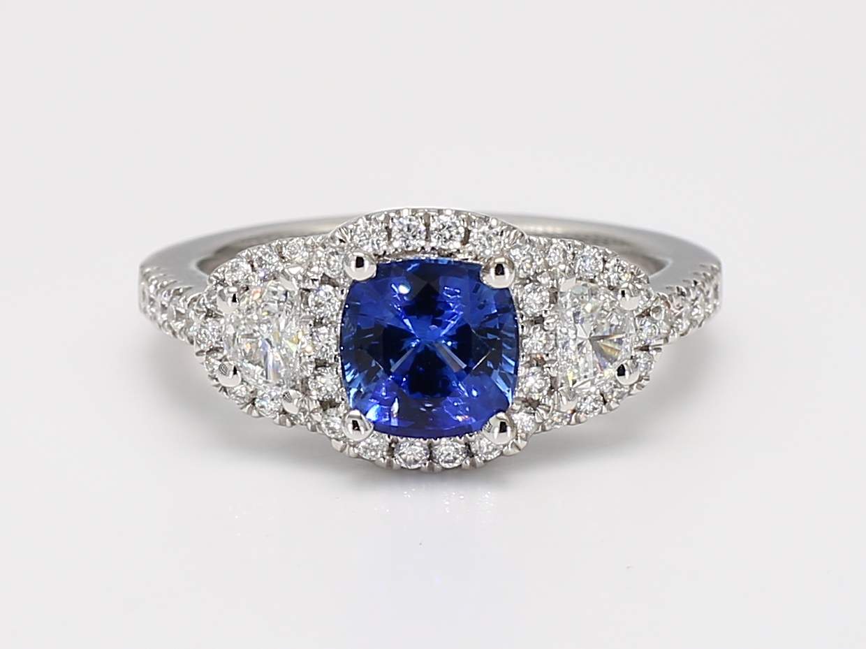 CUSHION CEYLON SAPPHIRE & HALF MOON & ROUND DIAMOND 18KW RING