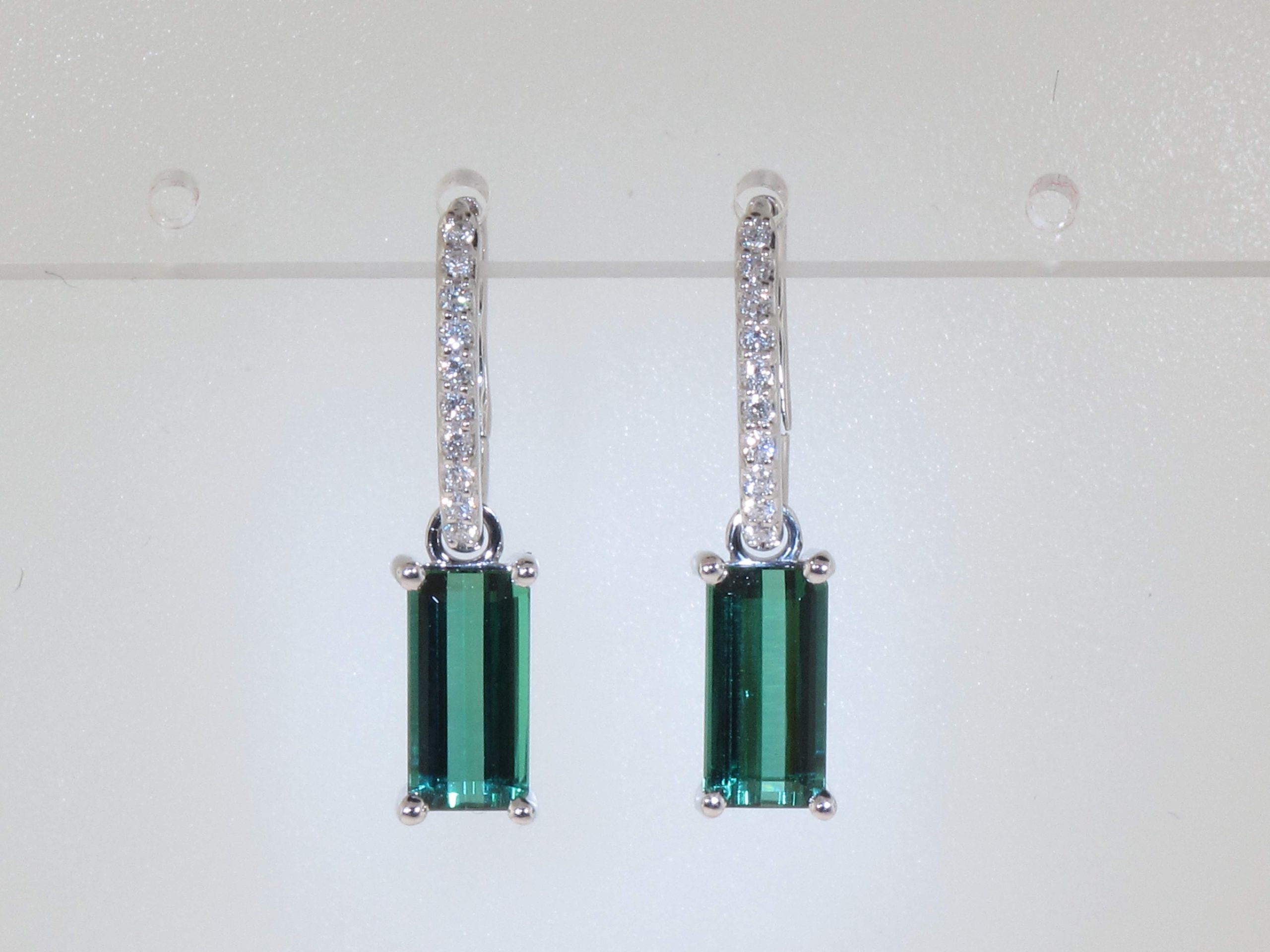 EMERALD CUT SEA BLUE GREEN TOURMALINE & ROUND DIAMOND 14KW EARRING
