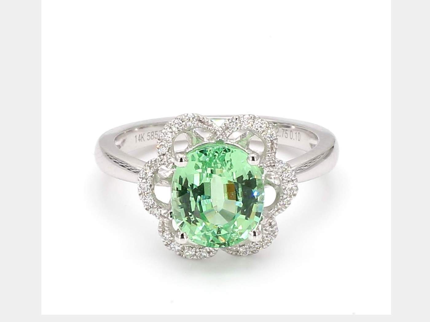 OVAL MINT GARNET & ROUND DIAMOND 14KW RING