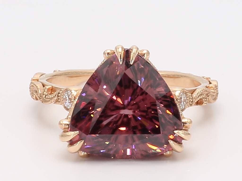 TRILLION RED ZIRCON & ROUND DIAMOND 14KR RING