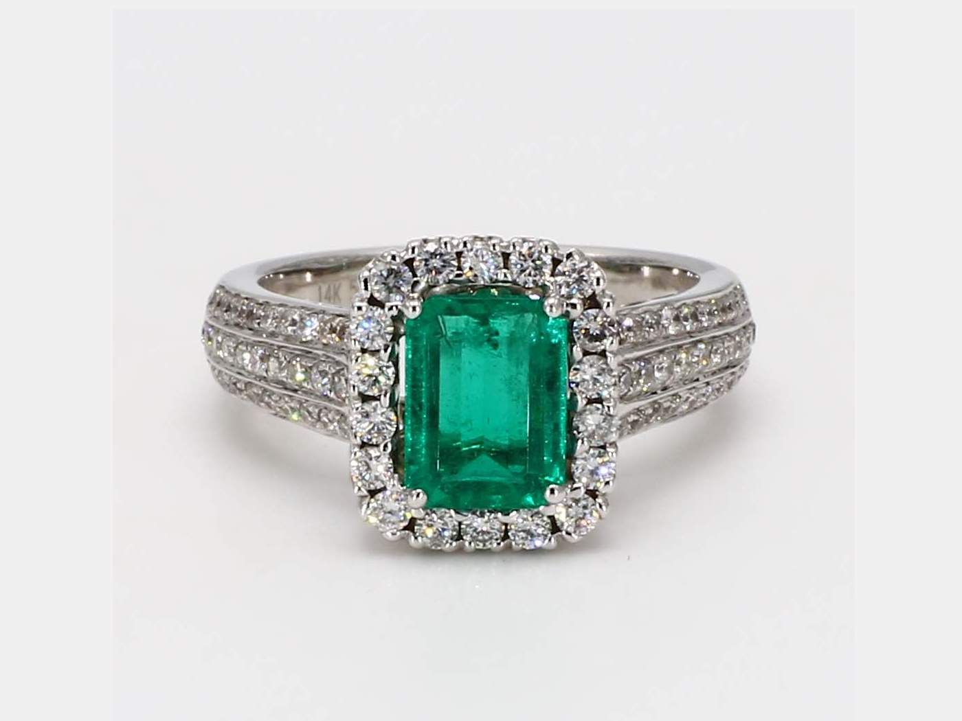 EMERALD CUT EMERALD & ROUND DIAMOND 14KW RING