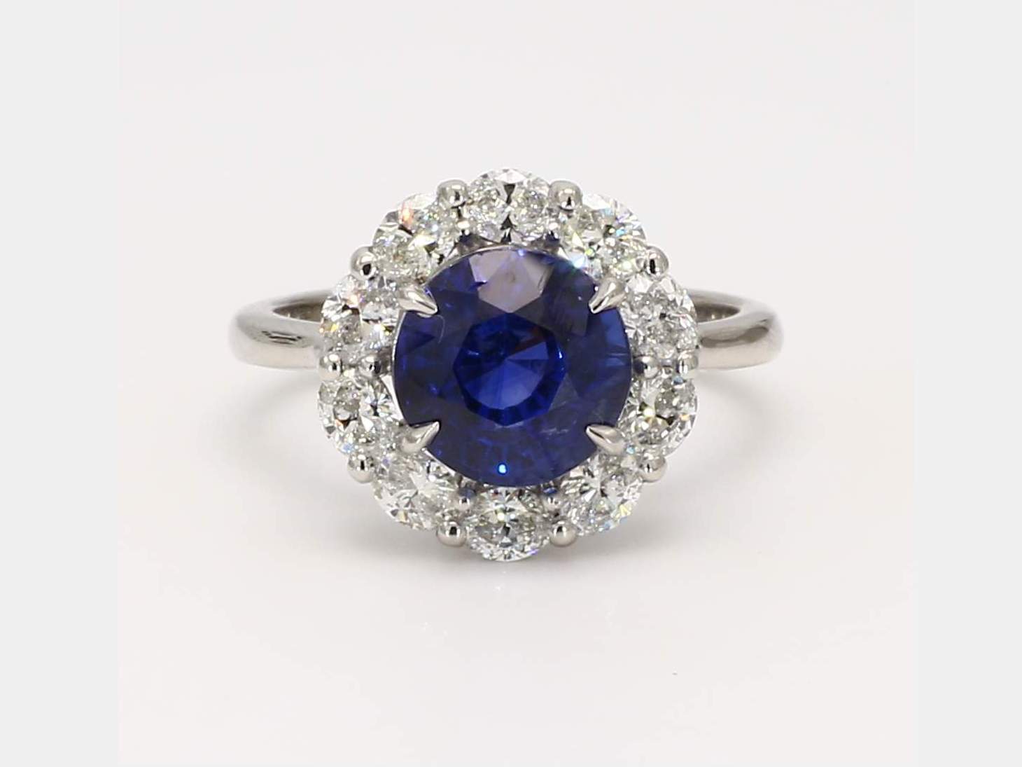ROUND CEYLON SAPPHIRE VIVID BLUE CDC 2108877 & OVAL DIAMOND PLATINUM RING