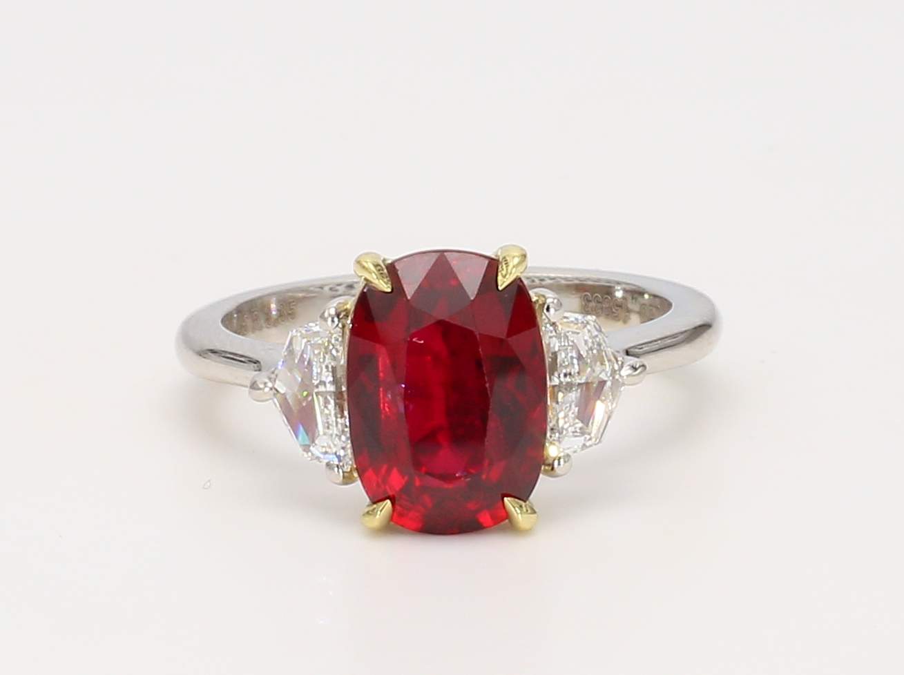 CUSHION RUBY GIA 2225137057 & EPAULETTE DIAMOND PLATINUM RING