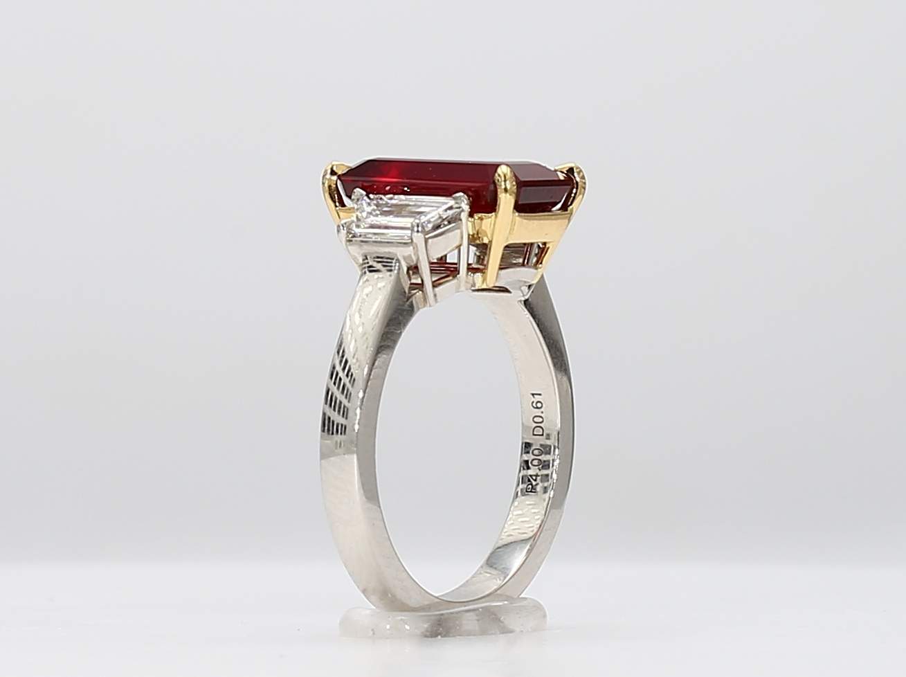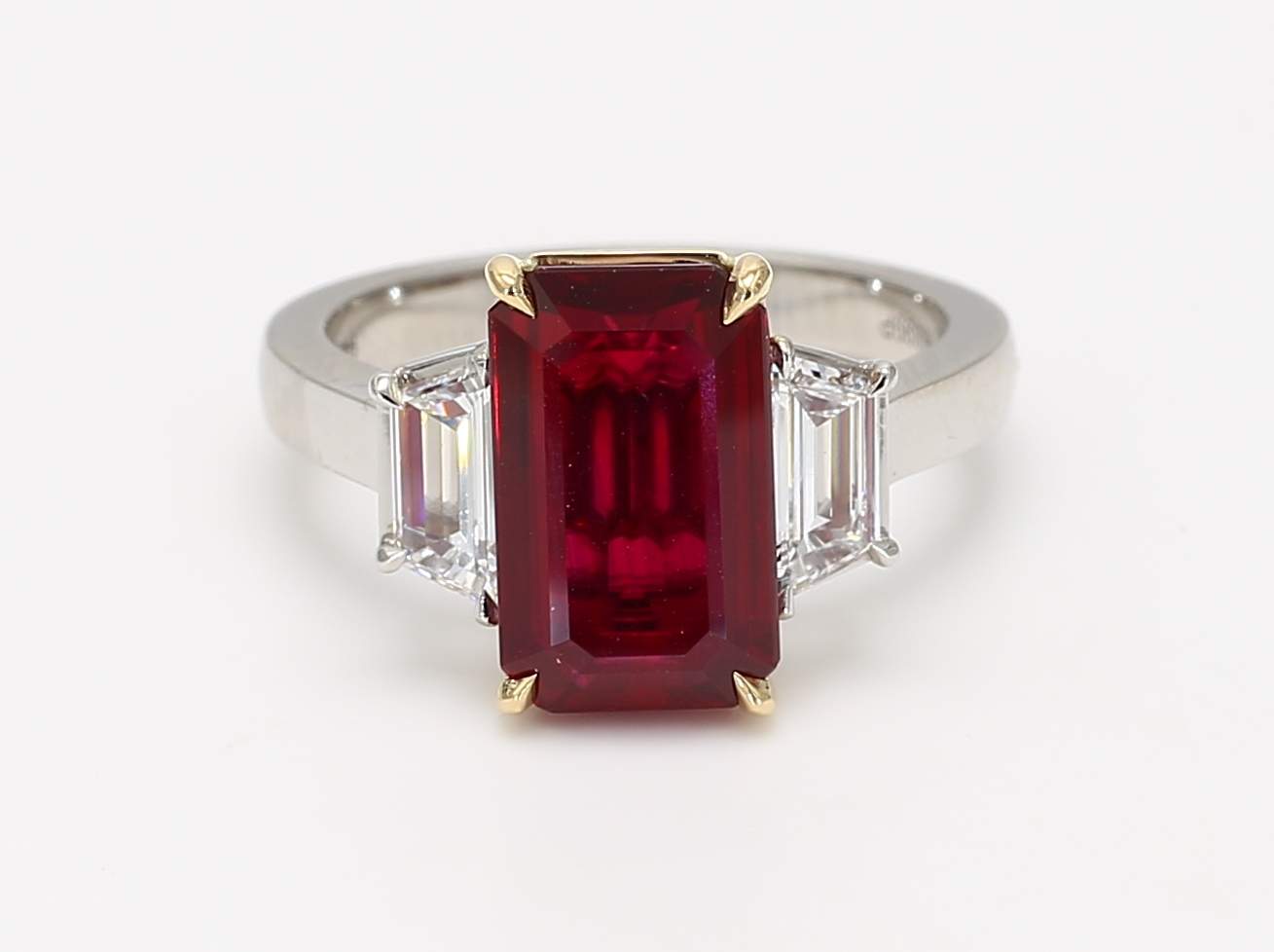 EMERALD CUT RUBY CDC 22011123 & TRAPEZOID DIAMOND PLATINUM RING