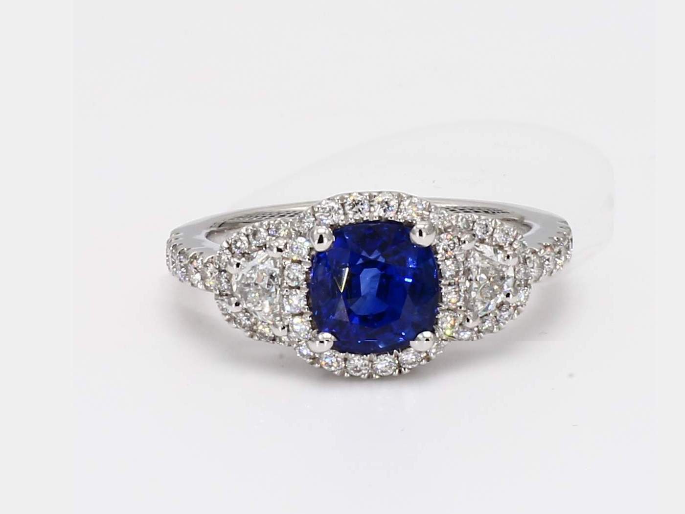CUSHION CEYLON SAPPHIRE CDC 1811362 & HALF MOON & ROUND DIAMOND PLATINUM RING