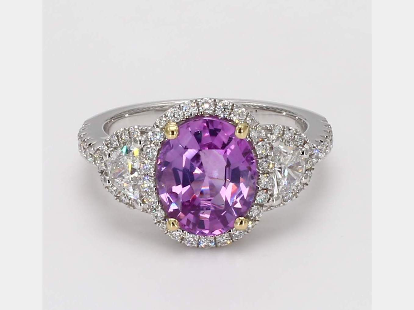 OVAL PINK SAPPHIRE CEYLON CDC 1811367 & HALF MOON & ROUND DIAMOND 14KW RING