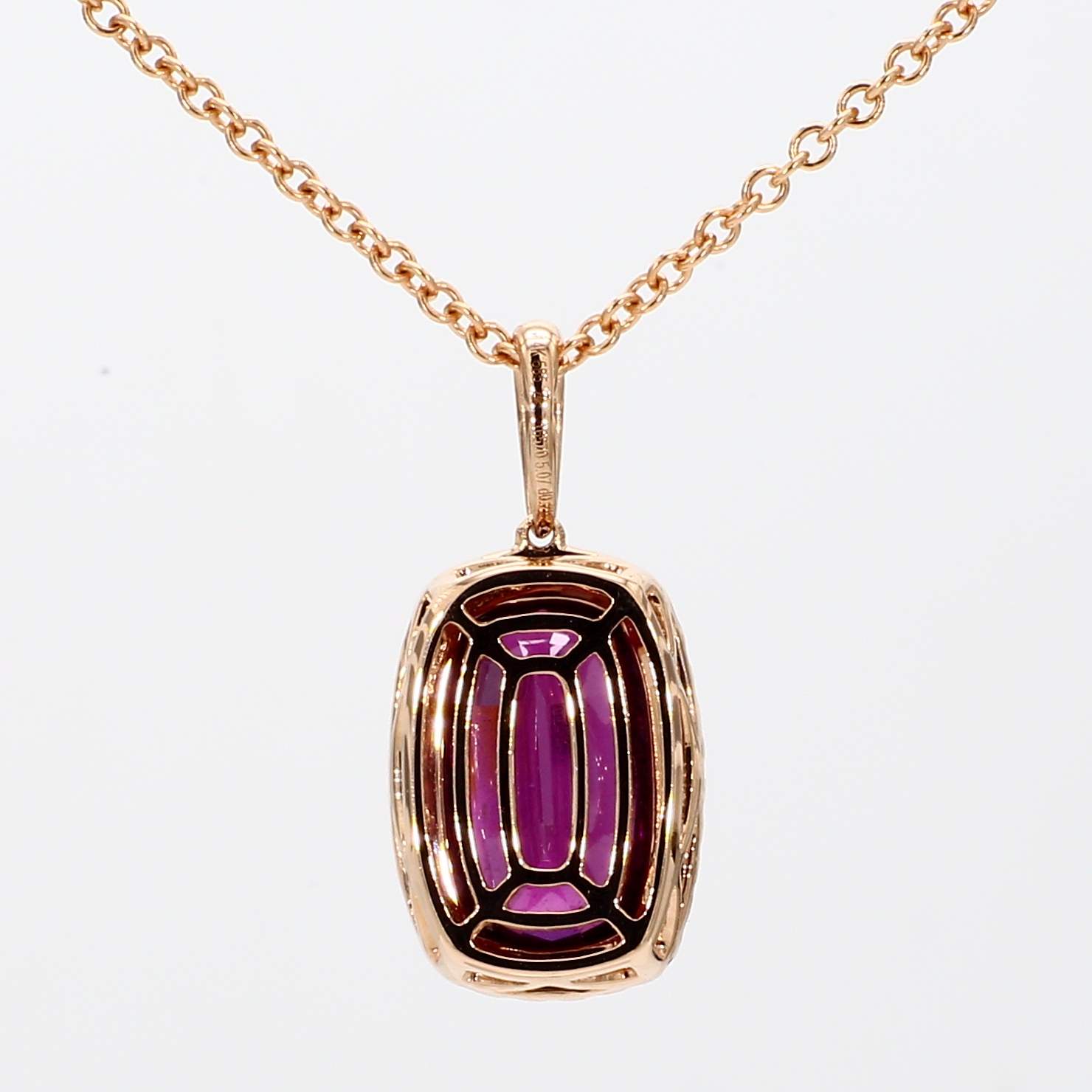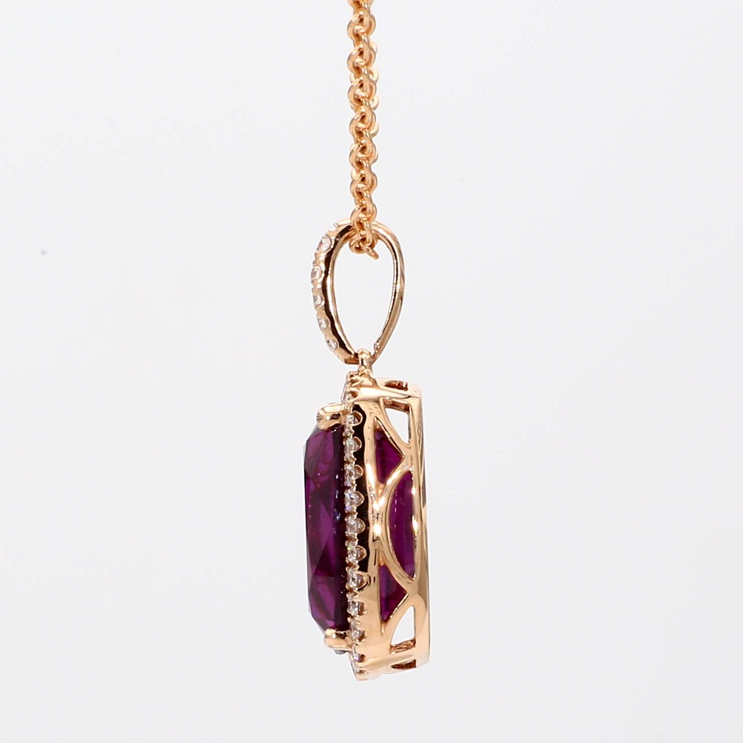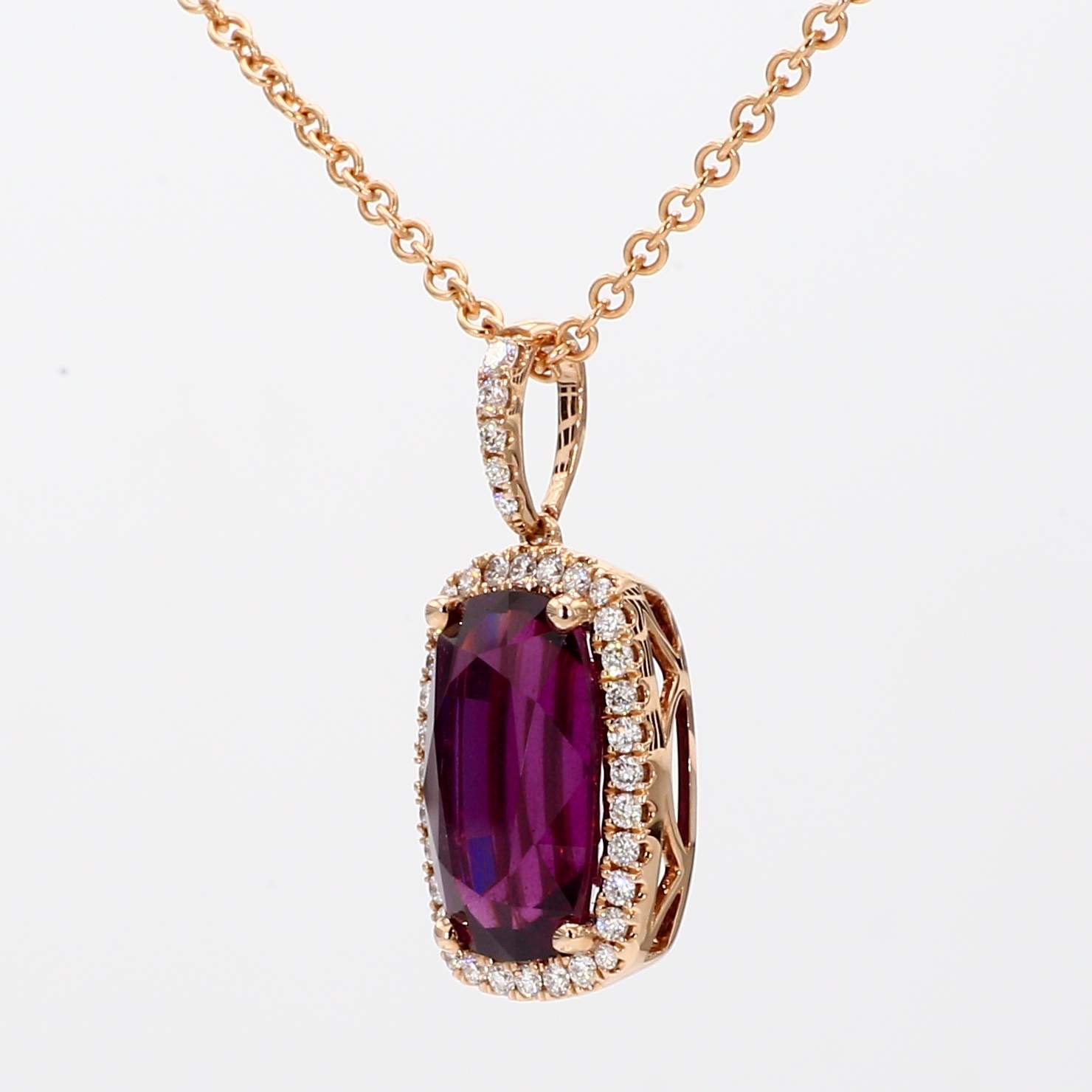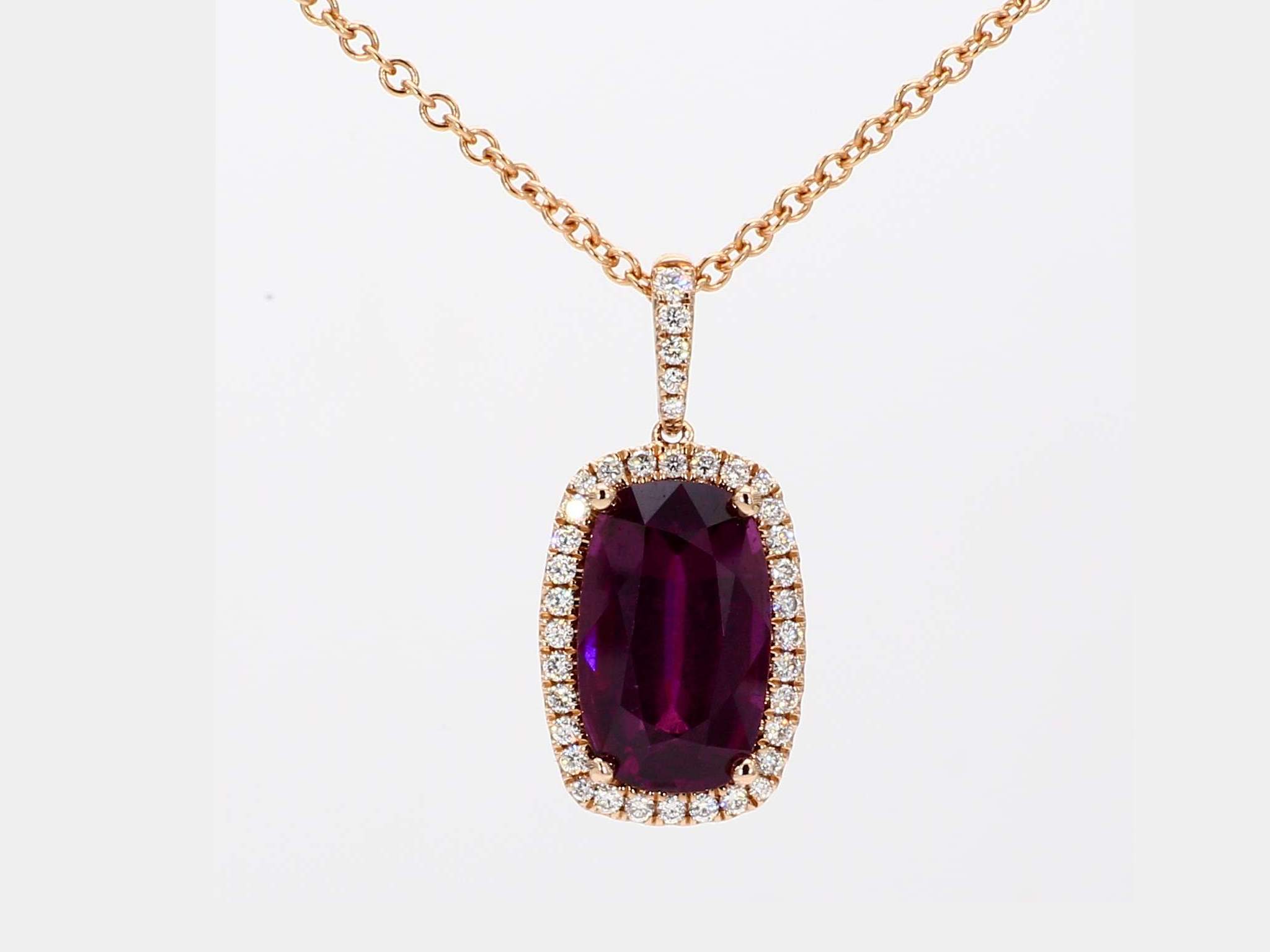 CUSHION RHODOLITE GARNET & ROUND DIAMOND 14KR PENDANT