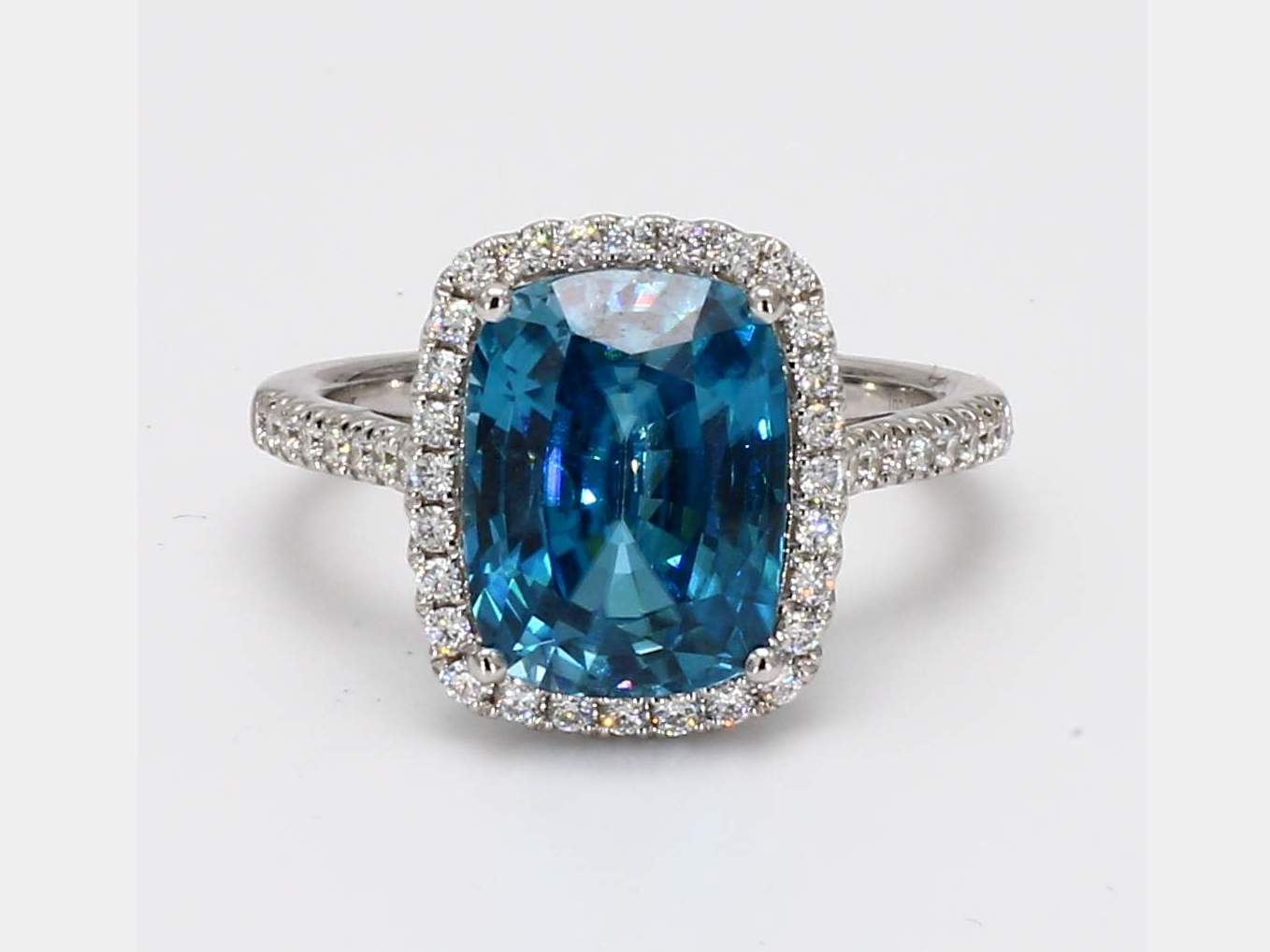 CUSHION BLUE ZIRCON & ROUND DIAMOND 14KW RING