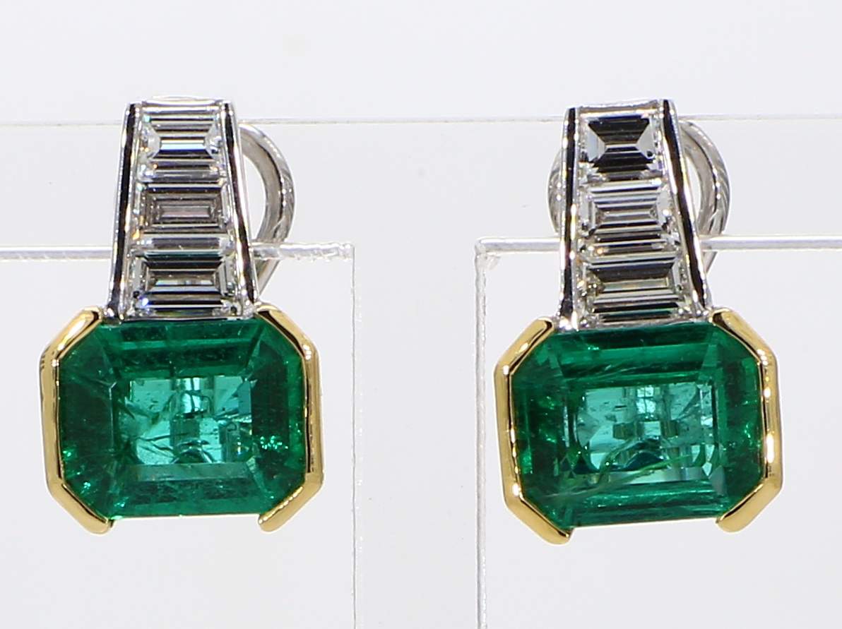 EMERALD CUT EMERALD & TRAPEZOID DIAMOND 18KT EARRING