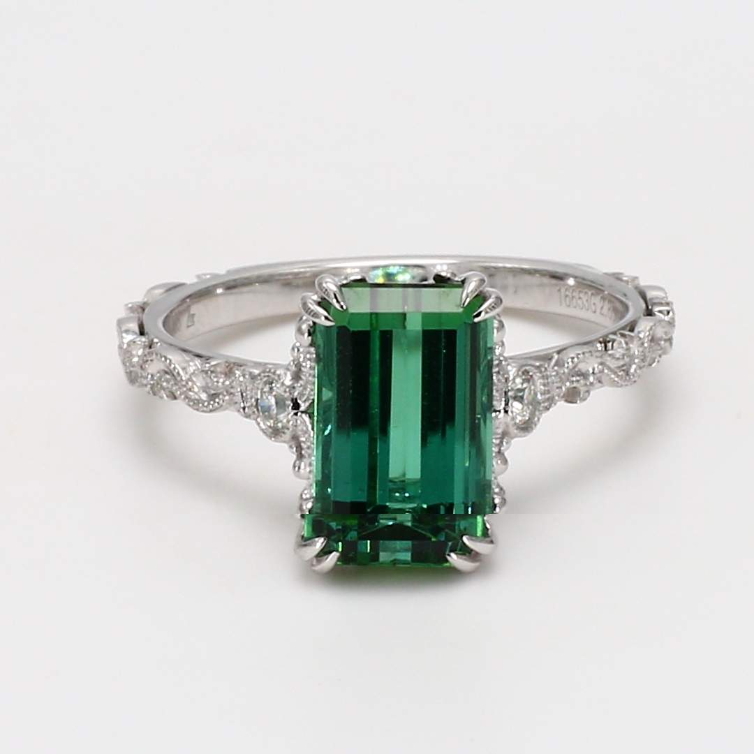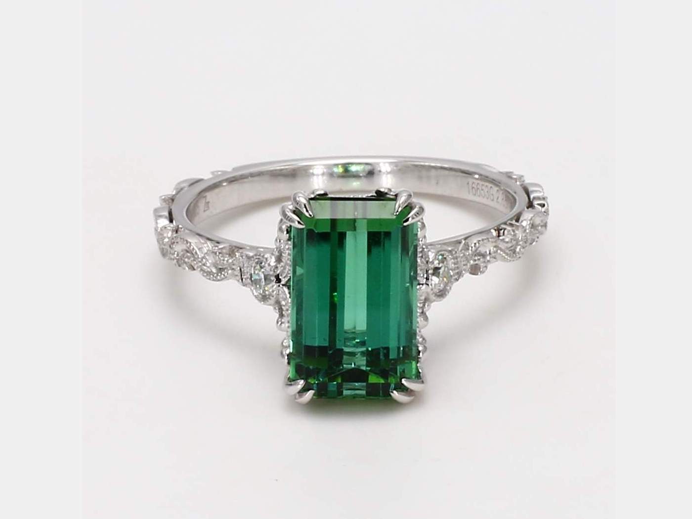 EMERALD CUT GREEN TOURMALINE & ROUND DIAMOND 14KW RING