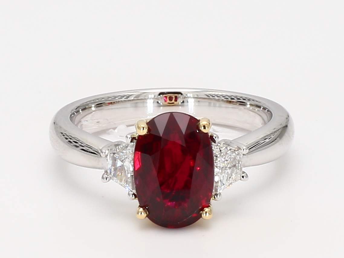 OVAL RUBY CDC 21111095 VIVID RED & TRAPEZOID DIAMOND PLATINUM RING