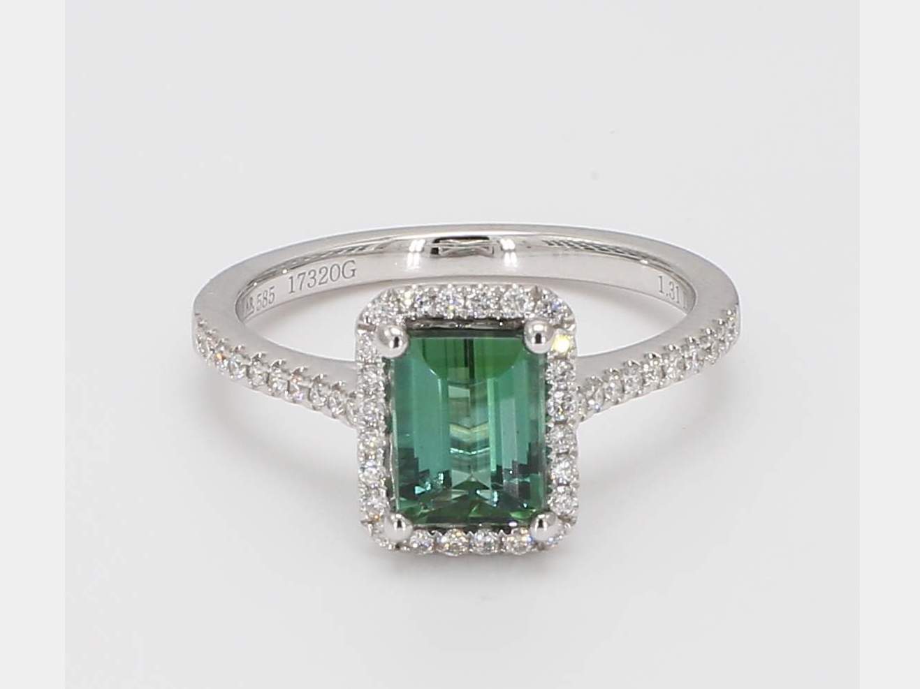EMERALD CUT GREEN TOURMALINE & ROUND DIAMOND 14KW RING