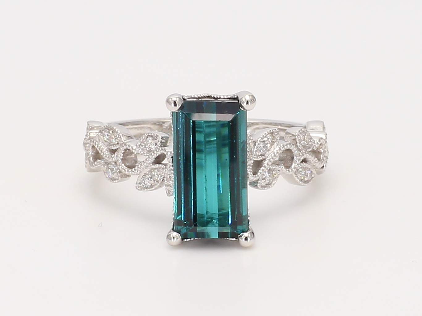 EMERALD CUT BLUE TOURMALINE & ROUND DIAMOND 14KW RING