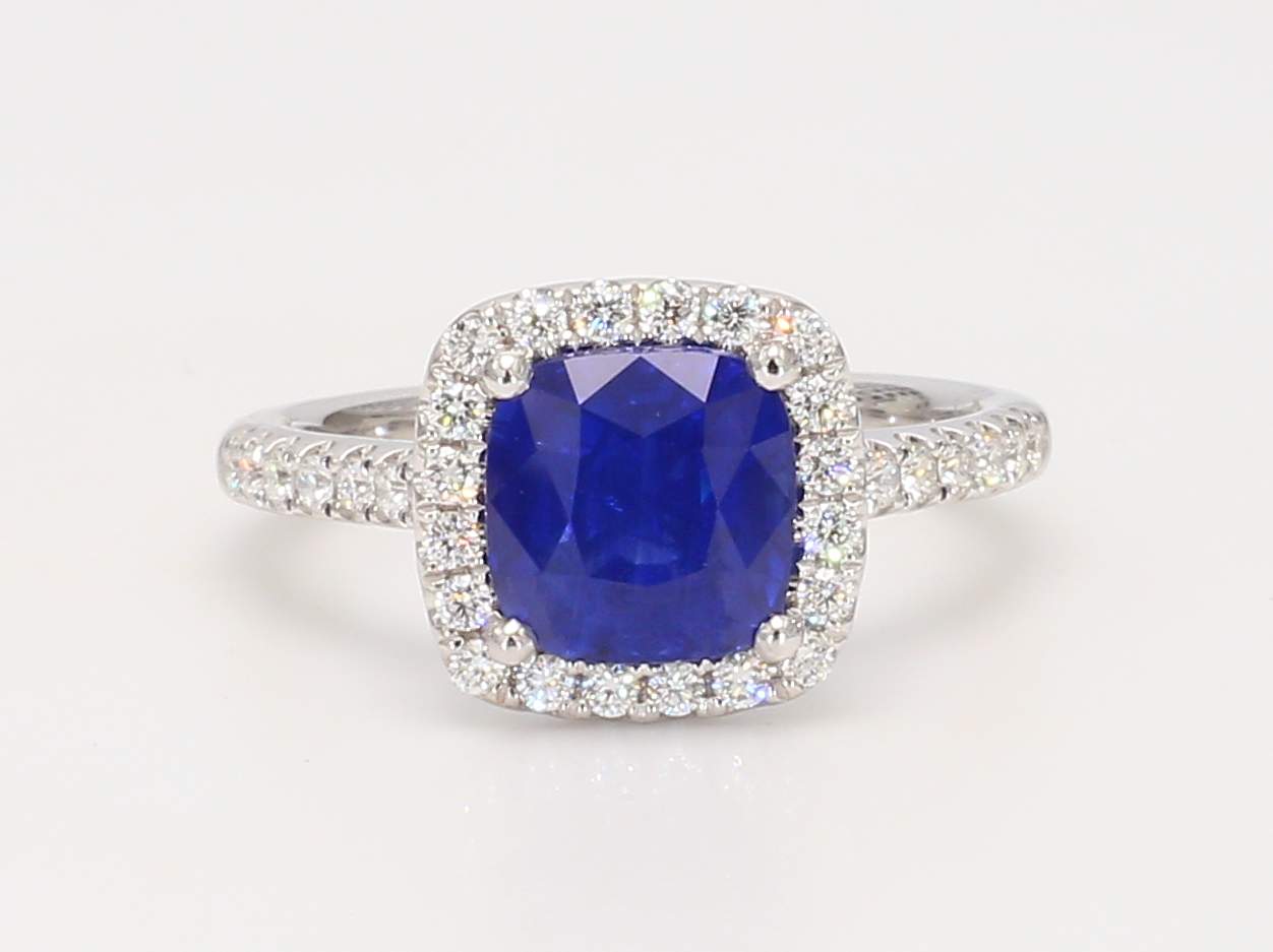 CUSHION CEYLON SAPPHIRE VIVID BLUE CDC 2206147 & ROUND DIAMOND PLATINUM RING