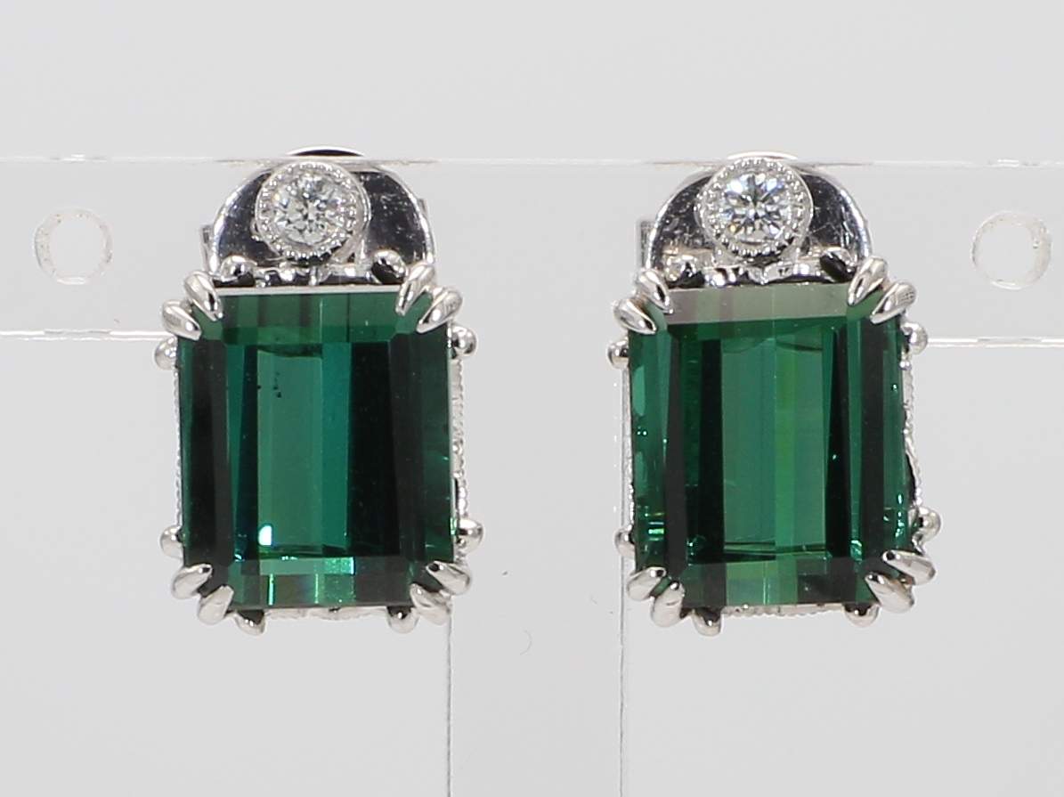 EMERALD CUT GREEN TOURMALINE & ROUND DIAMOND 14KW EARRING