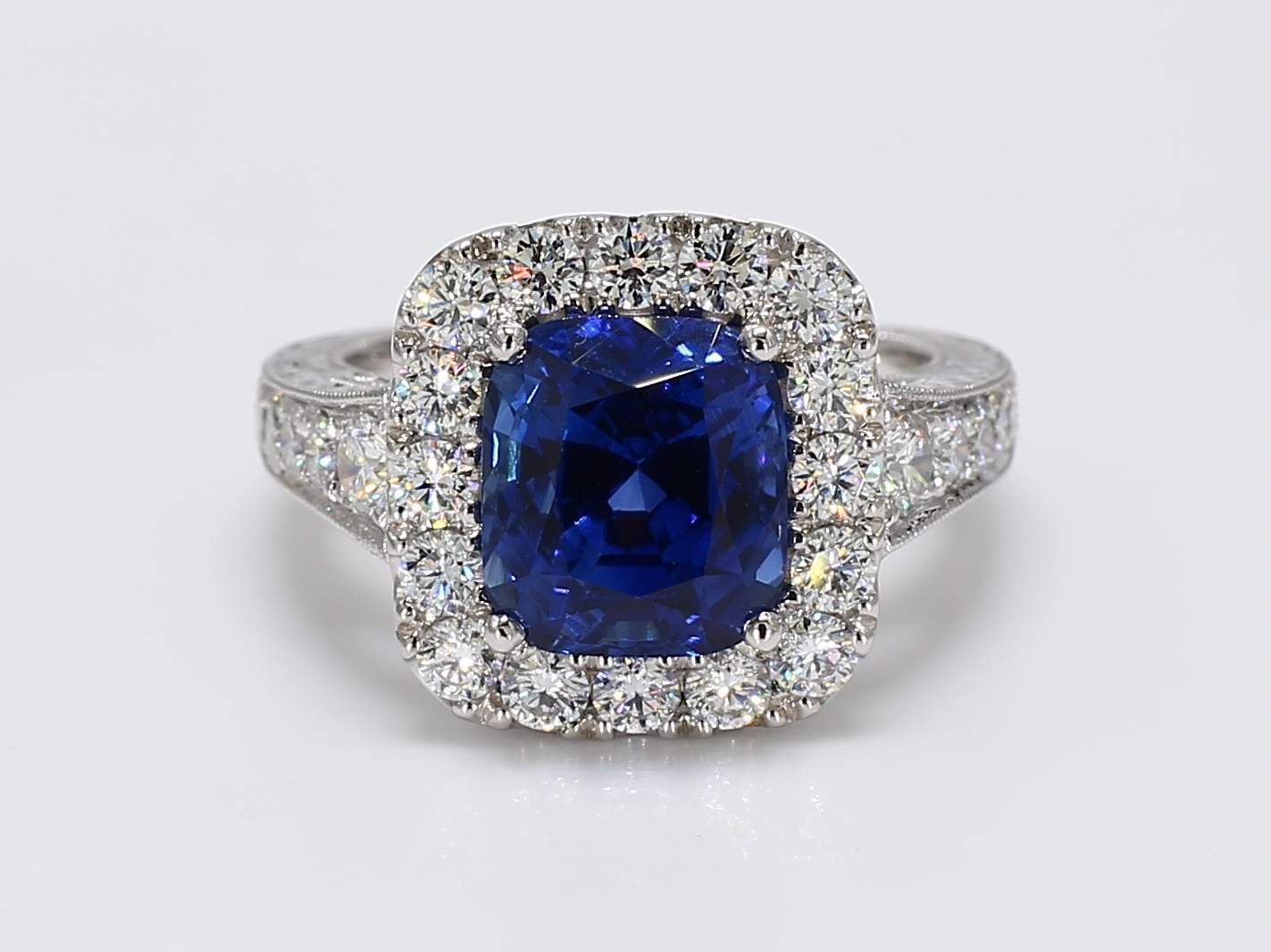 CUSHION CEYLON SAPPHIRE ROYAL BLUE GRS2017-107369 & ROUND DIAMOND PLATINUM RING