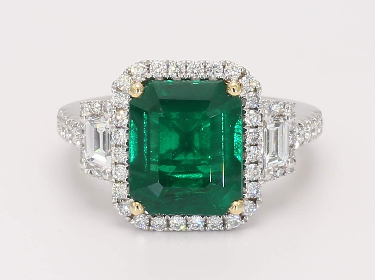EMERALD CUT EMERALD VIVID GREEN MINOR AIG GEM2022062265198 & TRAPEZOID & ROUND DIAMOND PLATINUM RING