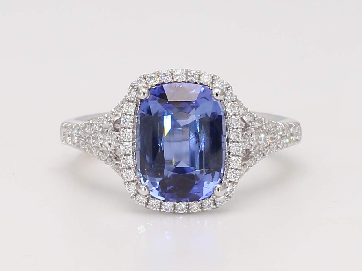 CUSHION SAPPHIRE VIVID BLUE CDC 2203551 & ROUND DIAMOND PLATINUM RING