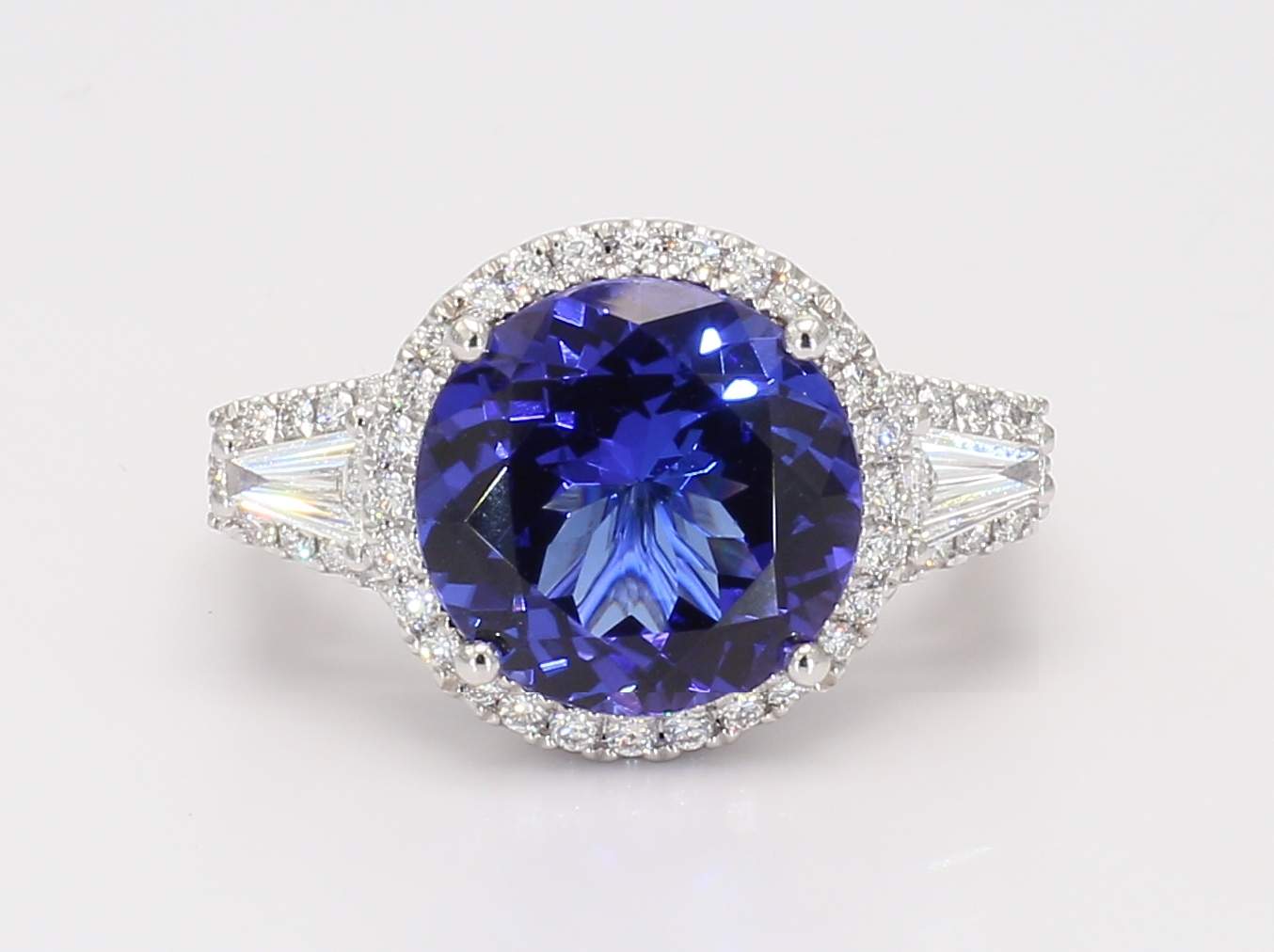 ROUND TANZANITE & TAPERED BAGUETTE & ROUND DIAMOND PLATINUM RING