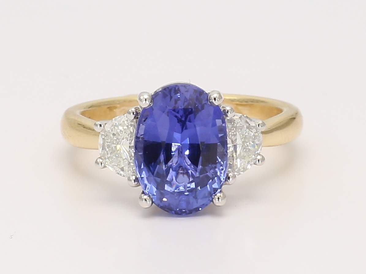 UNHEATED OVAL VIOLET SAPPHIRE CDC 2211913 & HALF MOON DIAMOND 18KY & PLATINUM RING