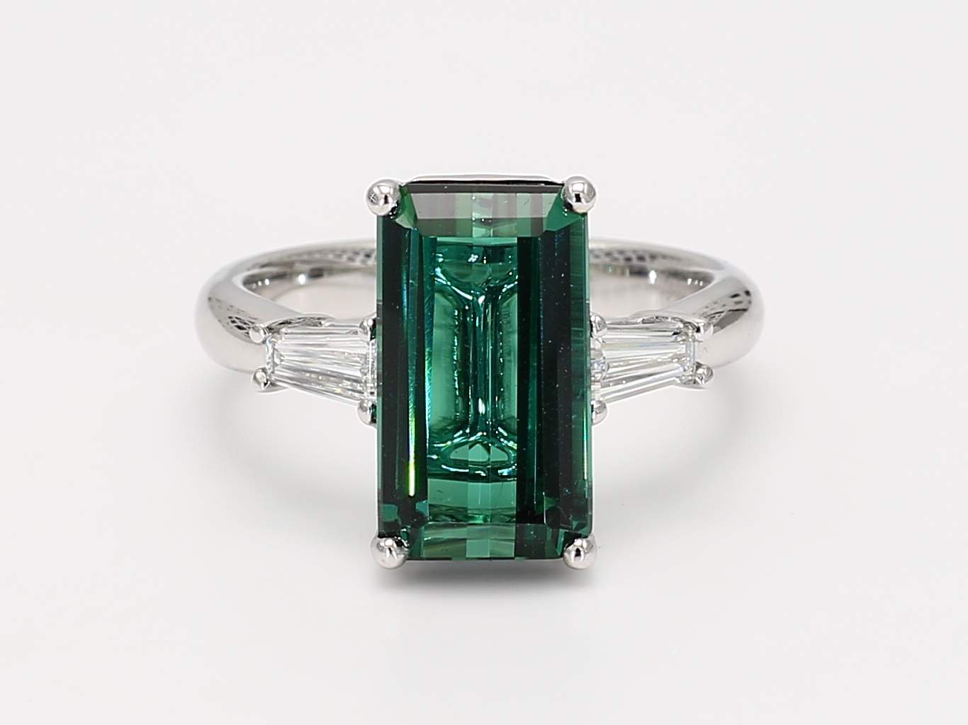 EMERALD CUT GREEN TOURMALINE & TAPER BAGUETTE DIAMOND 14KW RING