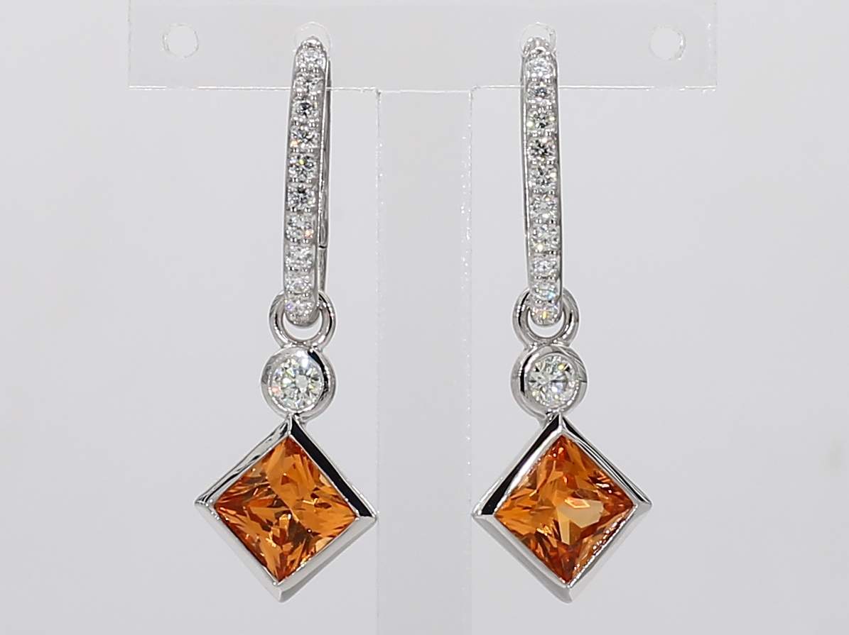 PRINCESS CUT MANDARIN GARNET & ROUND DIAMOND 14KW EARRING