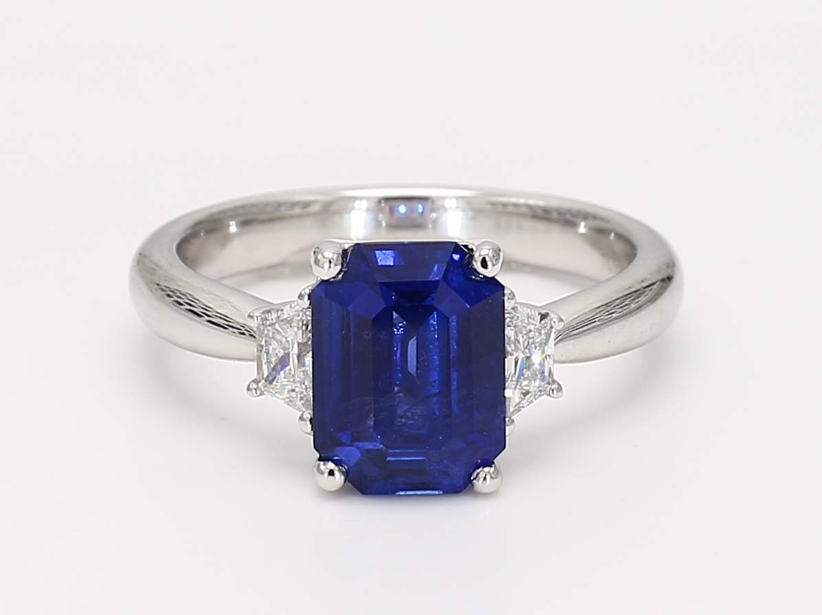 EMERALD CUT SAPPHIRE CDC 2303927 & TRAPEZOID DIAMOND 14KW RING