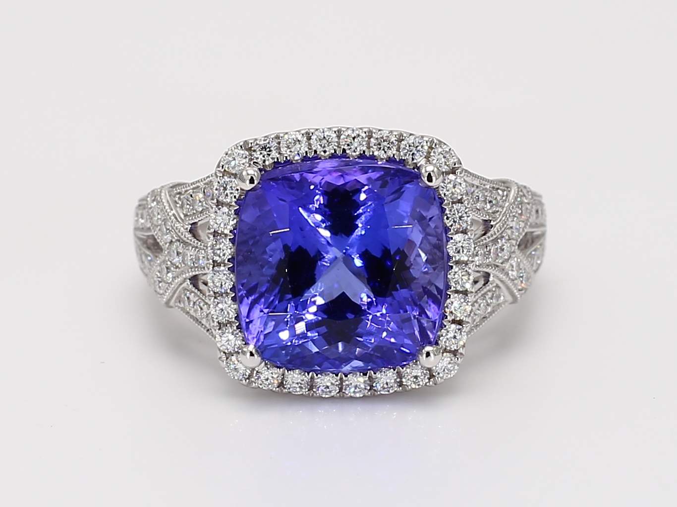 CUSHION TANZANITE & ROUND DIAMOND 14KW RING