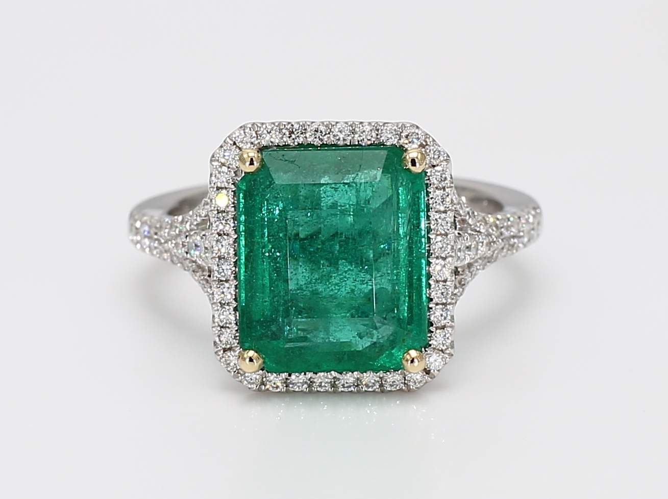 EMERALD CUT EMERALD VIVID GREEN MINOR CDC 23051037 & ROUND DIAMOND 14KW RING