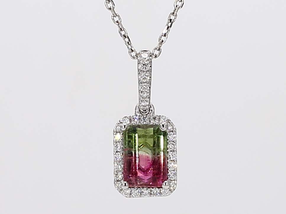EMERALD CUT WATERMELON TOURMALINE & ROUND DIAMOND 14KW PENDANT