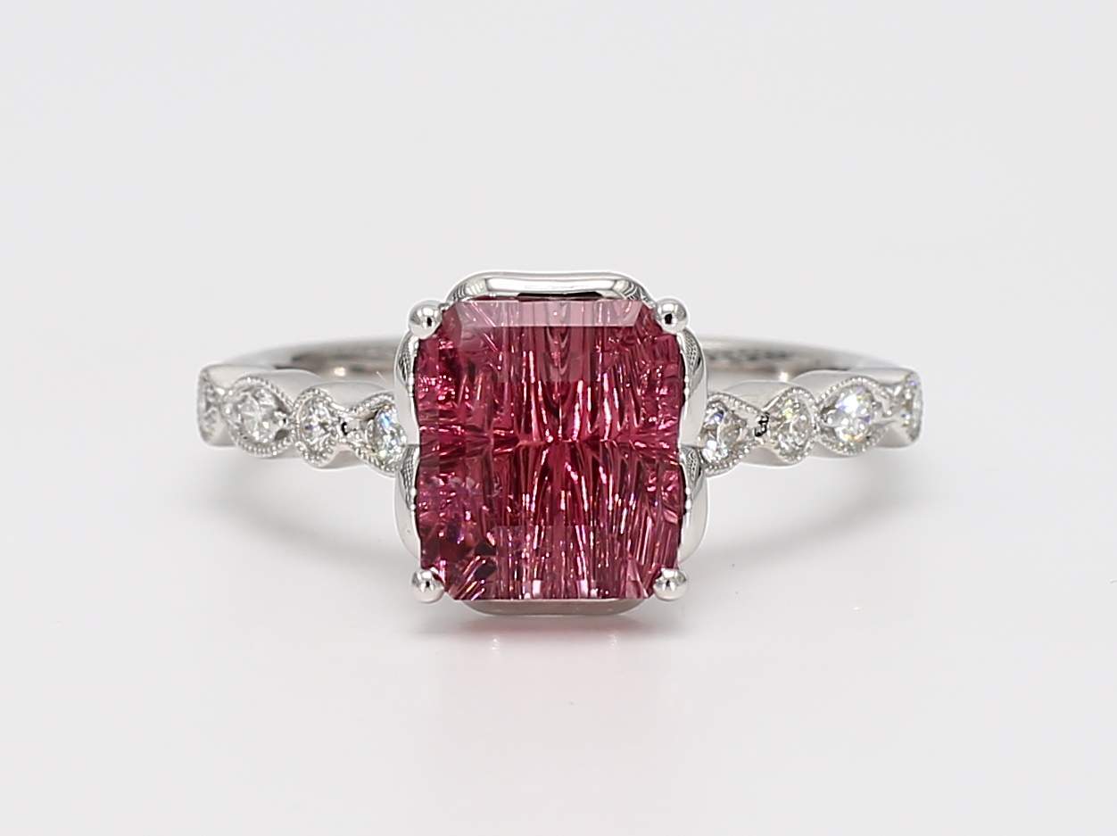 EMERALD CUT PINK TOURMALINE & ROUND DIAMOND 14KW RING