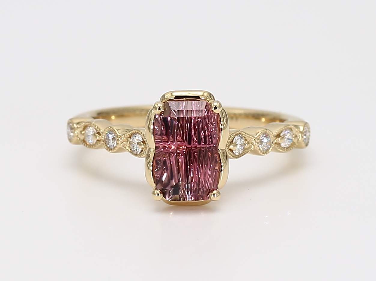 EMERALD CUT PINK TOURMALINE & ROUND DIAMOND 14KY RING