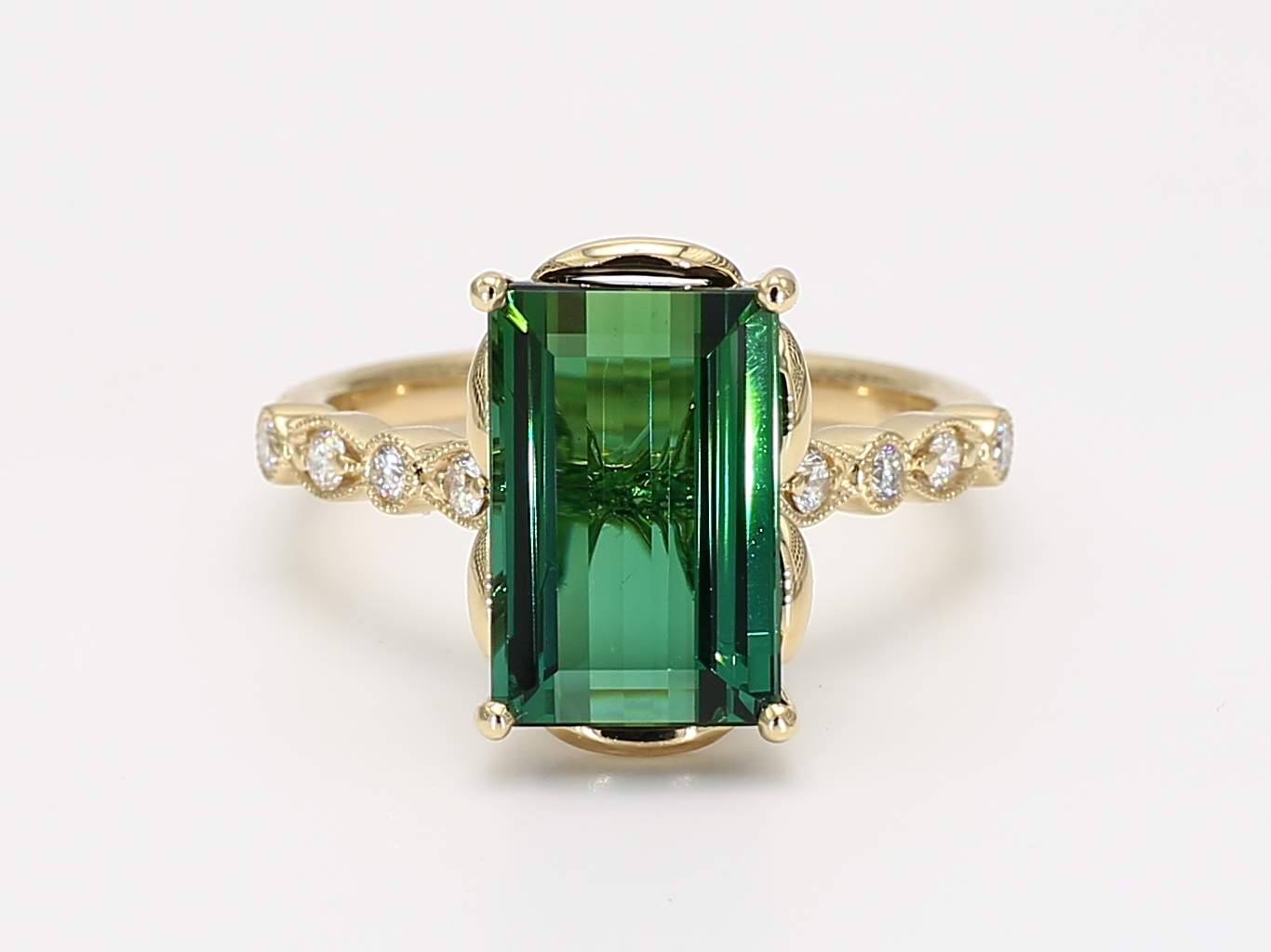 EMERALD CUT GREEN TOURMALINE & ROUND DIAMOND 14KY RING