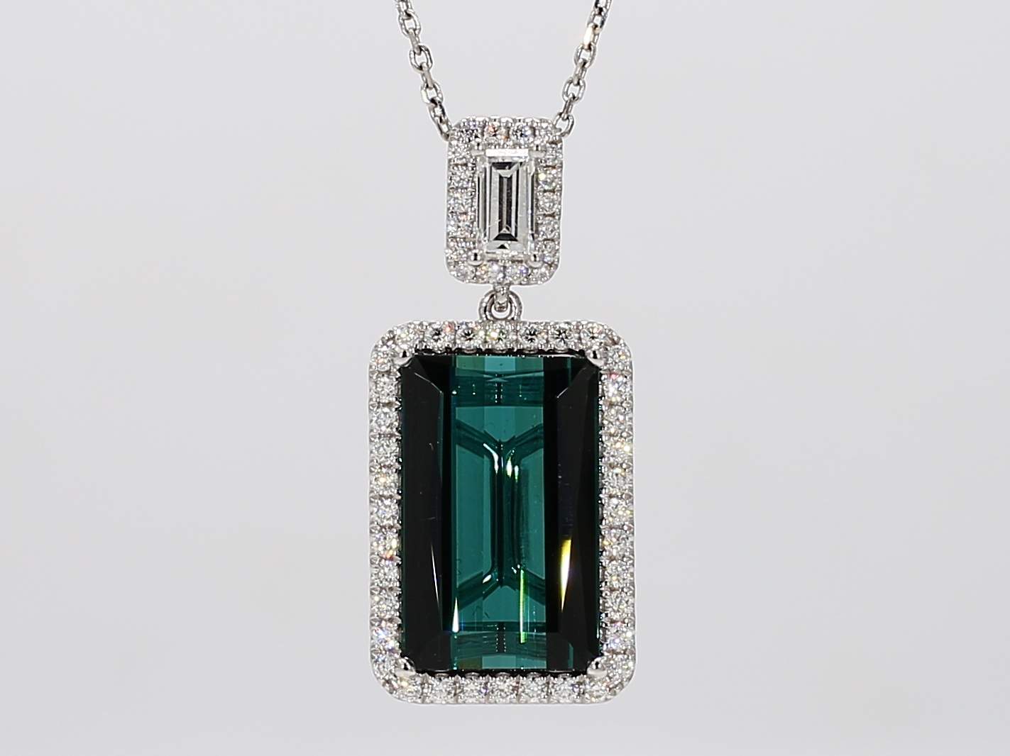 EMERALD CUT BLUE TOURMALINE & EMERALD CUT & ROUND DIAMOND 18KW PENDANT