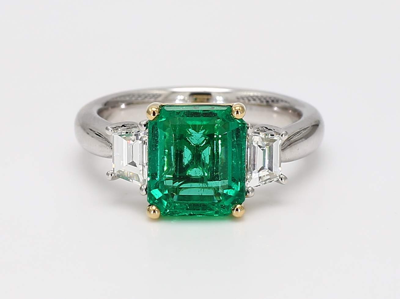 EMERALD CUT EMERALD VIVID GREEN MINOR CDC 2311190 & TRAPEZOID DIAMOND 18KY & PLATINUM RING