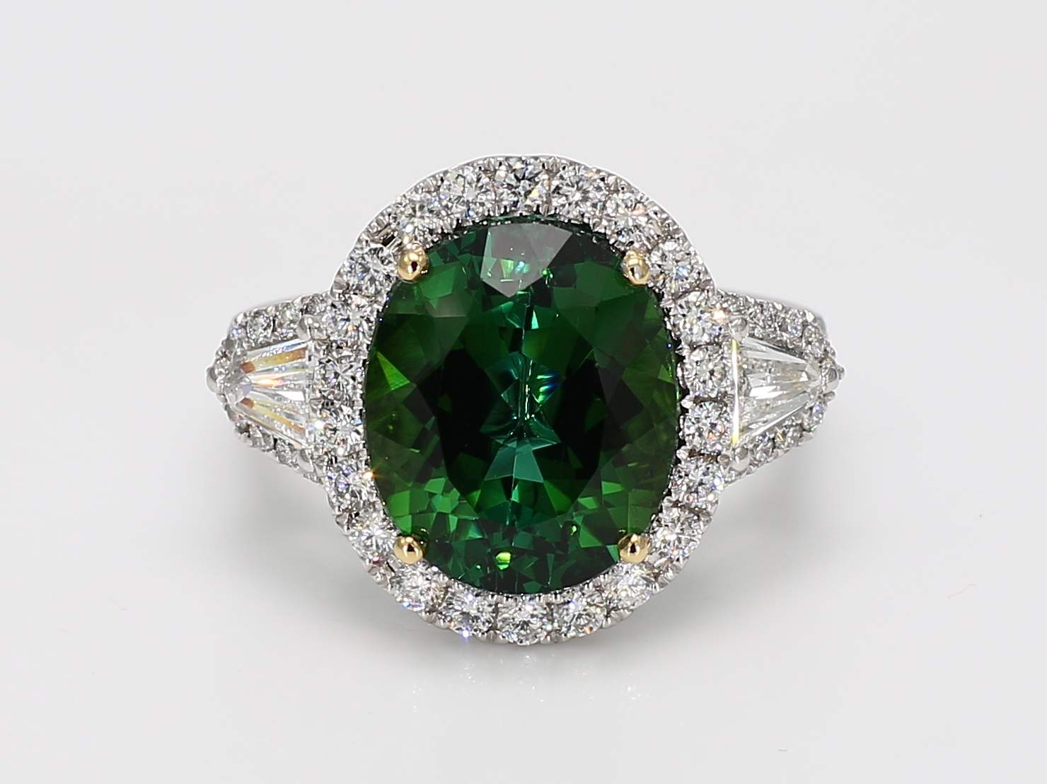 OVAL GREEN TOURMALINE & BULLET & ROUND DIAMOND PLATINUM RING