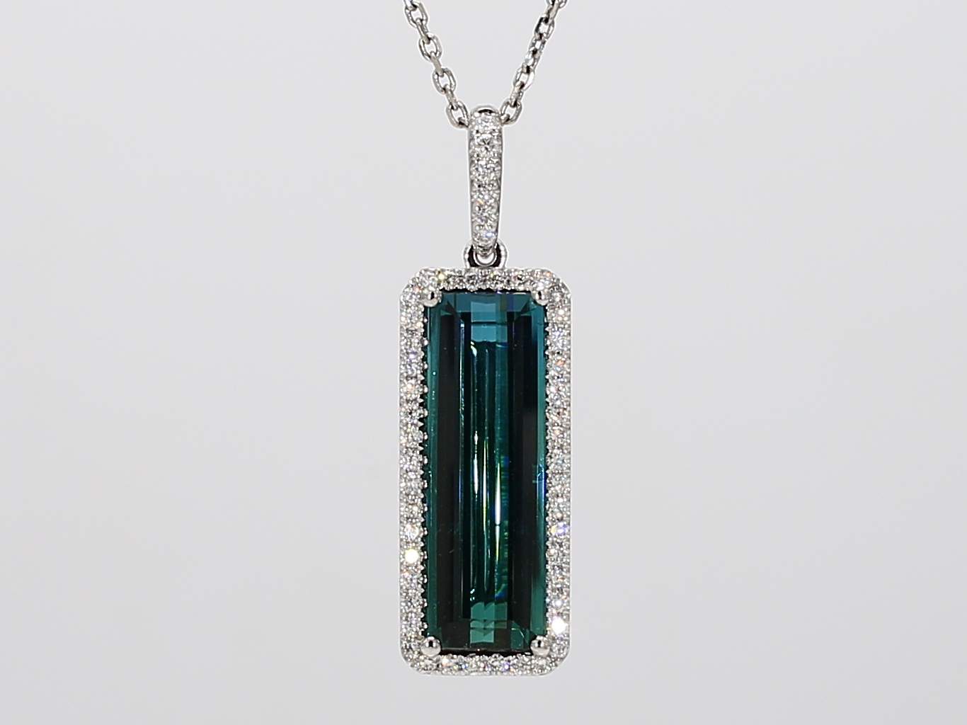 EMERALD CUT BLUE TOURMALINE & ROUND DIAMOND 18KW PENDANT